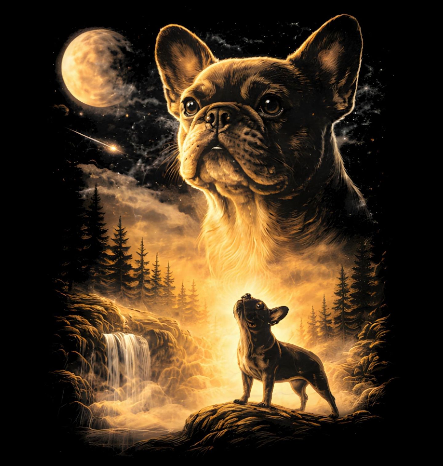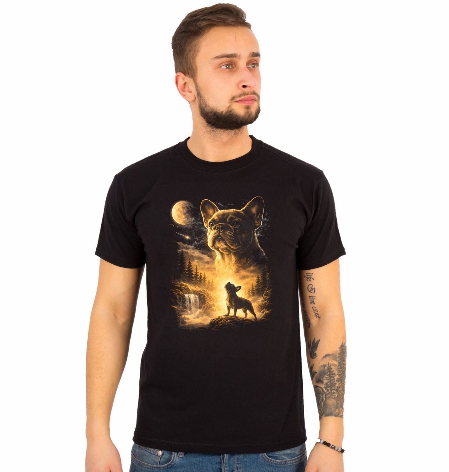 Pánské tričko Francouzský Buldoček a Kouzlo Úplňku. Stylový motiv zachycuje psa plemene francouzského buldočka v noční scenérii s úplňkem, hvězdami a mlhou. Tento design zasazený do nočního lesa vyzařuje eleganci i sílu osobnosti, kterou je toto plemeno známé, a dodává celému obrazu moderní nádech.