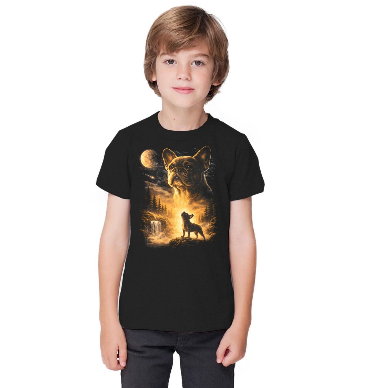 Dětské tričko Francouzský Buldoček a Kouzlo Úplňku. Stylový motiv zachycuje psa plemene francouzského buldočka v noční scenérii s úplňkem, hvězdami a mlhou. Tento design zasazený do nočního lesa vyzařuje eleganci i sílu osobnosti, kterou je toto plemeno známé, a dodává celému obrazu moderní nádech.