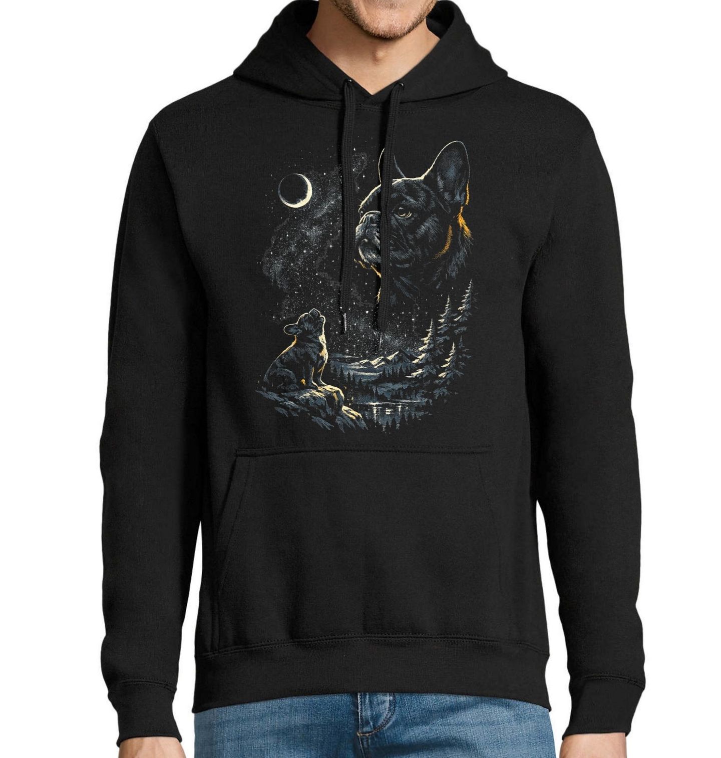 Pánská mikina Francouzský Buldoček pod Hvězdami. Tento působivý motiv zobrazuje psa plemene francouzského buldočka v tajemné noční krajině pod hvězdnou oblohou a srpkem měsíce. Silueta malého psa hledícího k nebi spolu s velkým portrétem v pozadí vytváří atmosféru klidu, síly a věrnosti. Design pes osloví milovníky francouzských buldočků.