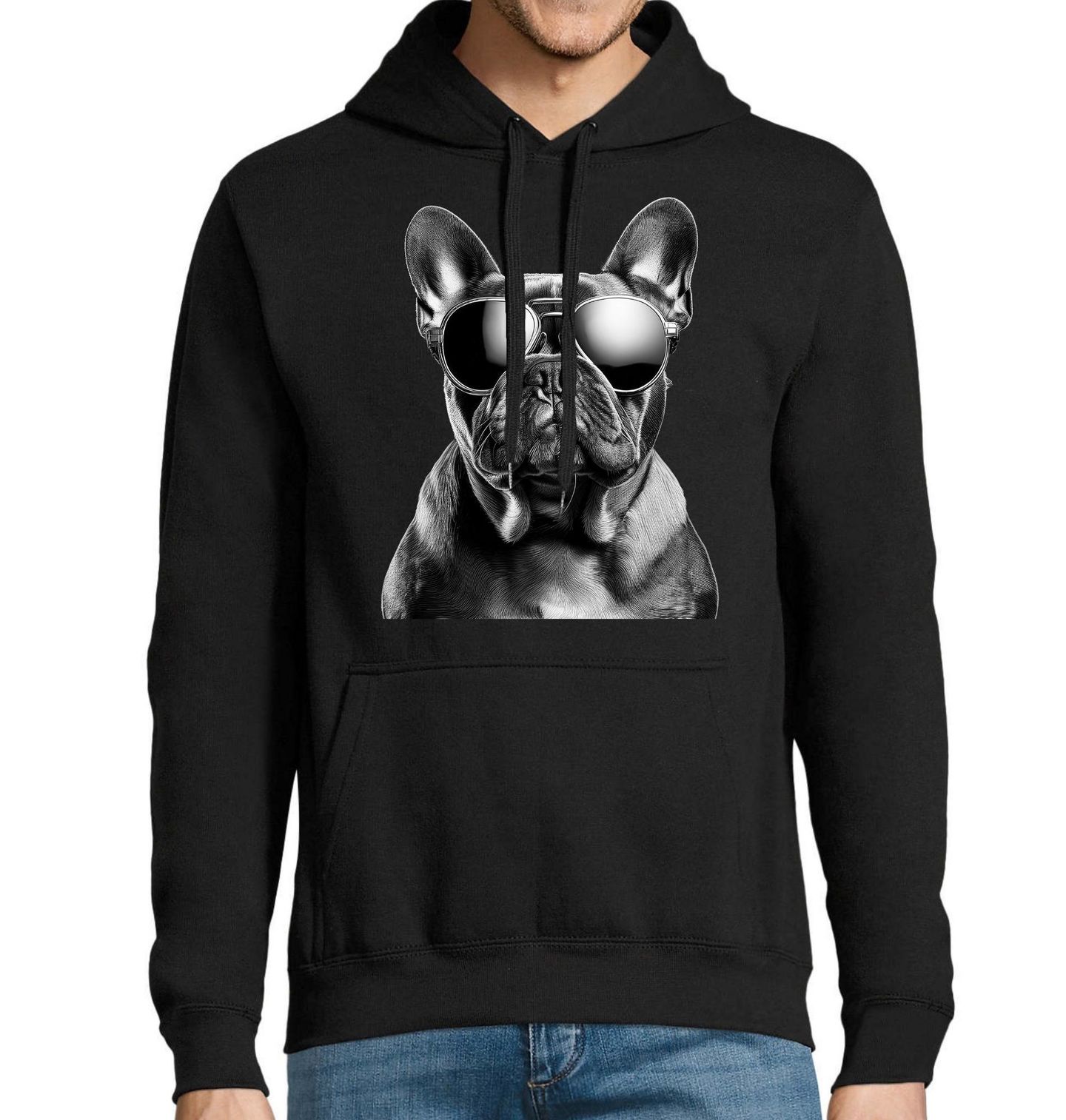 Pánská mikina Francouzský buldoček s Brýlemi. Originální motiv, na kterém vyniká Francouzský buldoček v moderních brýlích, zaujme každého milovníka psího stylu a humoru. Tento design spojuje roztomilost i osobitý výraz, díky čemuž je ideální pro každého, kdo je hrdý pejskař a pro koho je pes součást každodenního života. Francouzský buldoček patří mezi nejoblíbenější plemena a jeho ikonický vzhled dodává motivu jedinečný charakter.