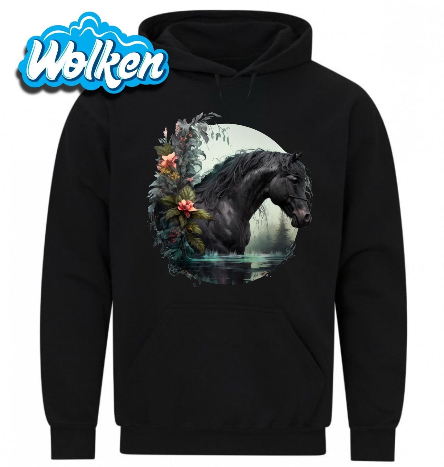 Pánská mikina Fríský Černý kůň ve vodě. Elegantní fríský kůň s hustou černou hřívou stojí uprostřed klidné vody, obklopen hibiskusy a lesními květinami. Tento motiv spojuje sílu, tajemství a krásu přírody, vytvářející mystickou atmosféru. Ideální pro milovníky koní a přírodních motivů.