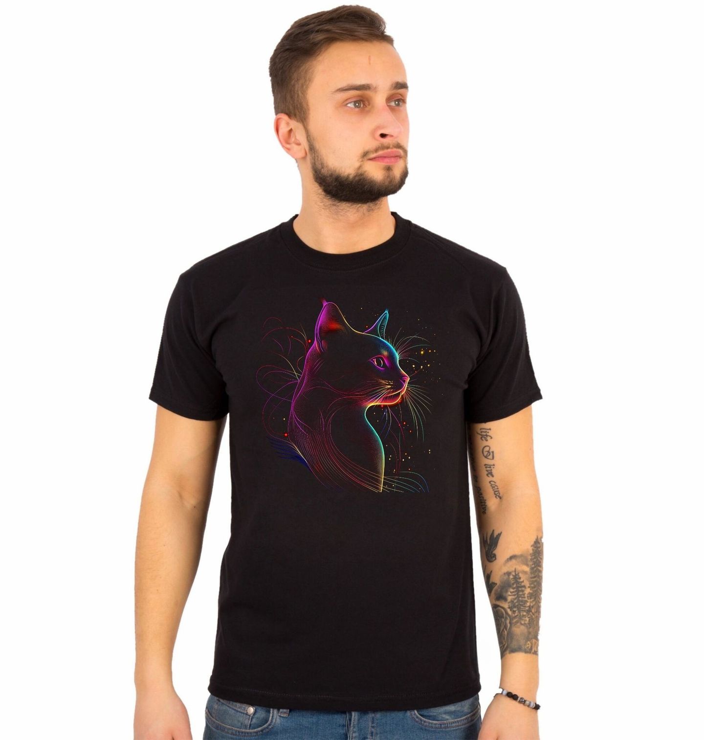 Pánské tričko Galaktická Kočka. Futuristický motiv, kde hraje hlavní roli kočka s neonovým zářením, která jako by přicestovala z jiné galaxie. Tahle kočka propojuje eleganci, tajemství a vesmírnou energii. Je ideální volbou pro všechny milovníky koček, originality a jedinečného stylu.