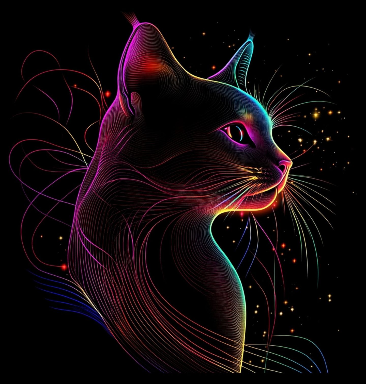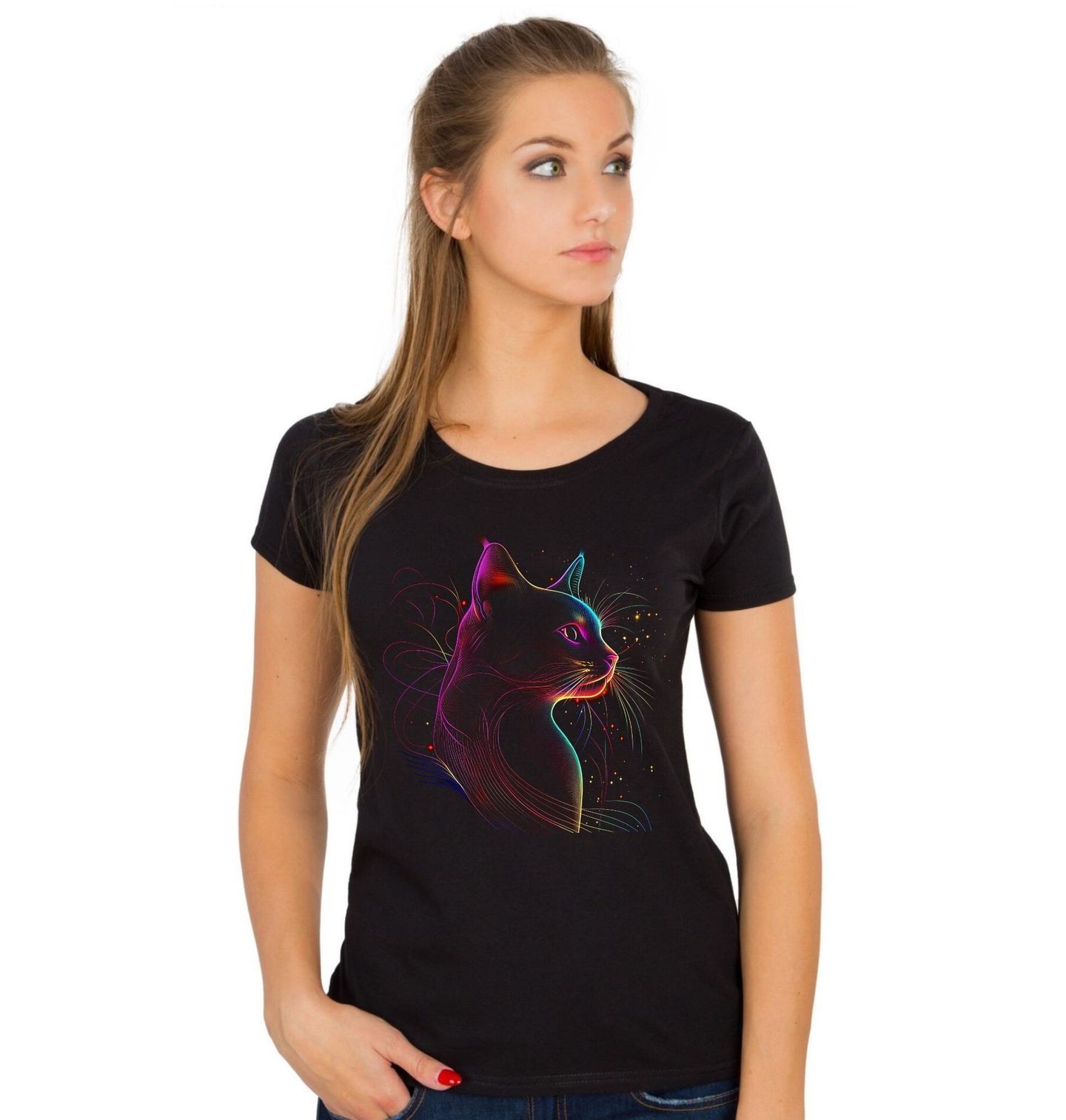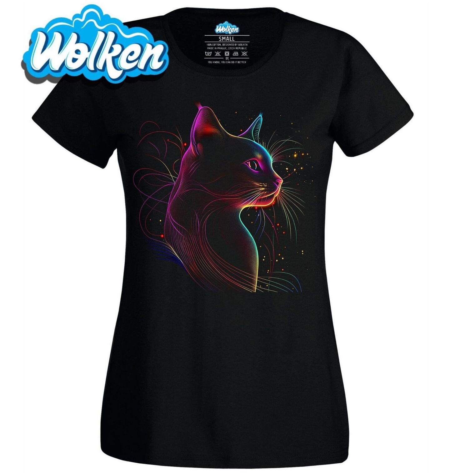 Dámské tričko Galaktická Kočka. Futuristický motiv, kde hraje hlavní roli kočka s neonovým zářením, která jako by přicestovala z jiné galaxie. Tahle kočka propojuje eleganci, tajemství a vesmírnou energii. Je ideální volbou pro všechny milovníky koček, originality a jedinečného stylu.