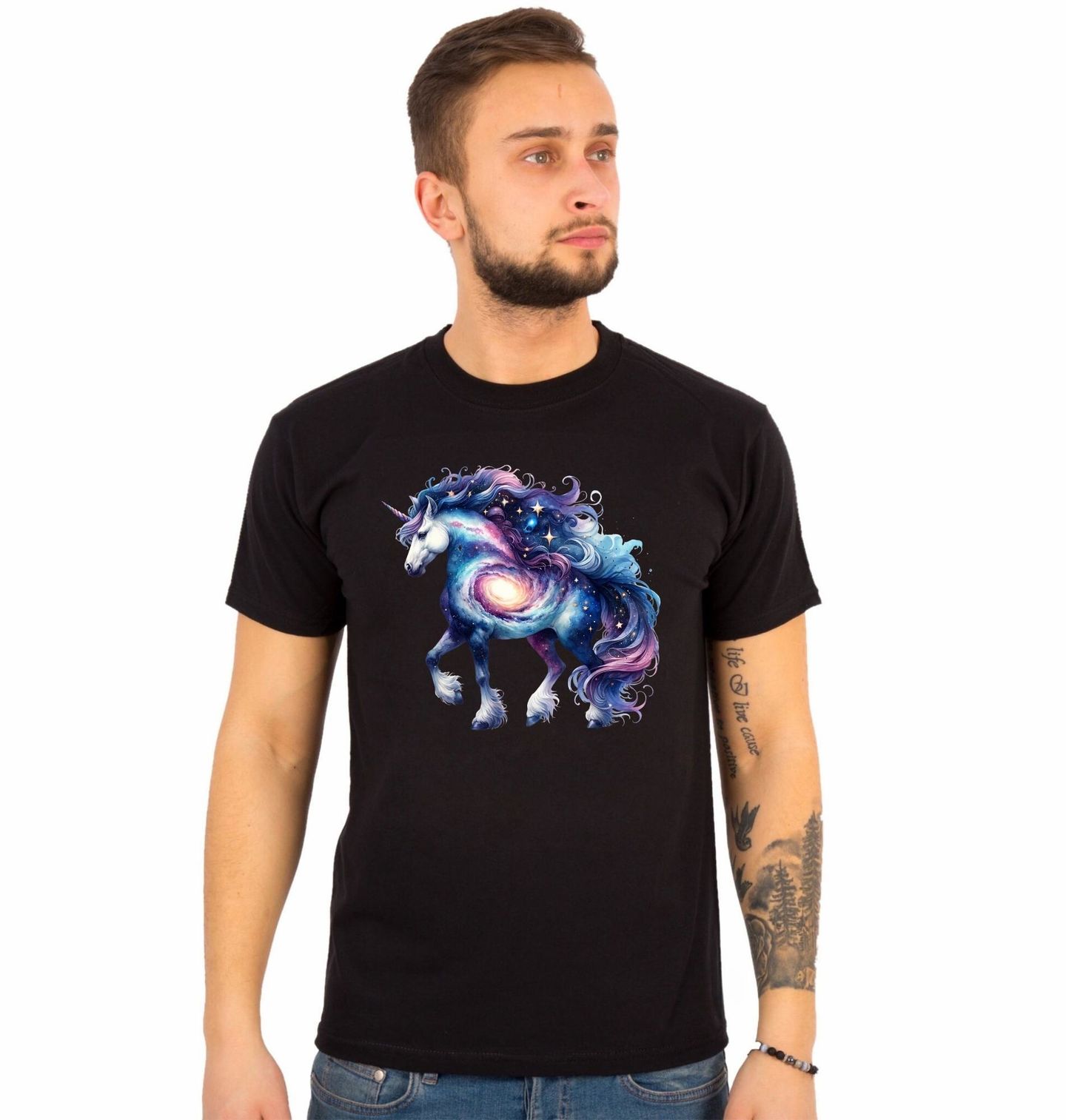Pánské tričko Galaktický Jednorožec z Hvězdné Mlhoviny. Vstupte do vesmíru fantazie, kde jednorožec nese na svém těle celou galaxii! Tento úchvatný potisk s vesmírnými motivy, hvězdami a vírem galaxií je jako stvořený pro děti, které milují sny, hvězdy a pohádková stvoření.
