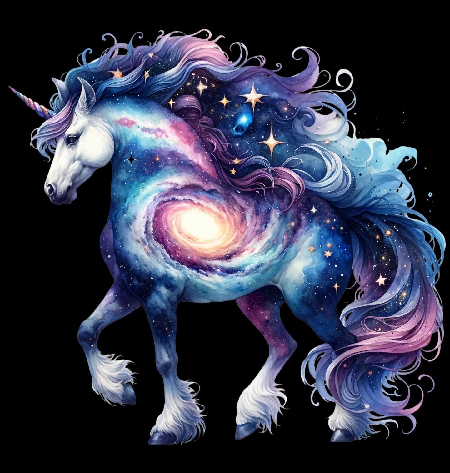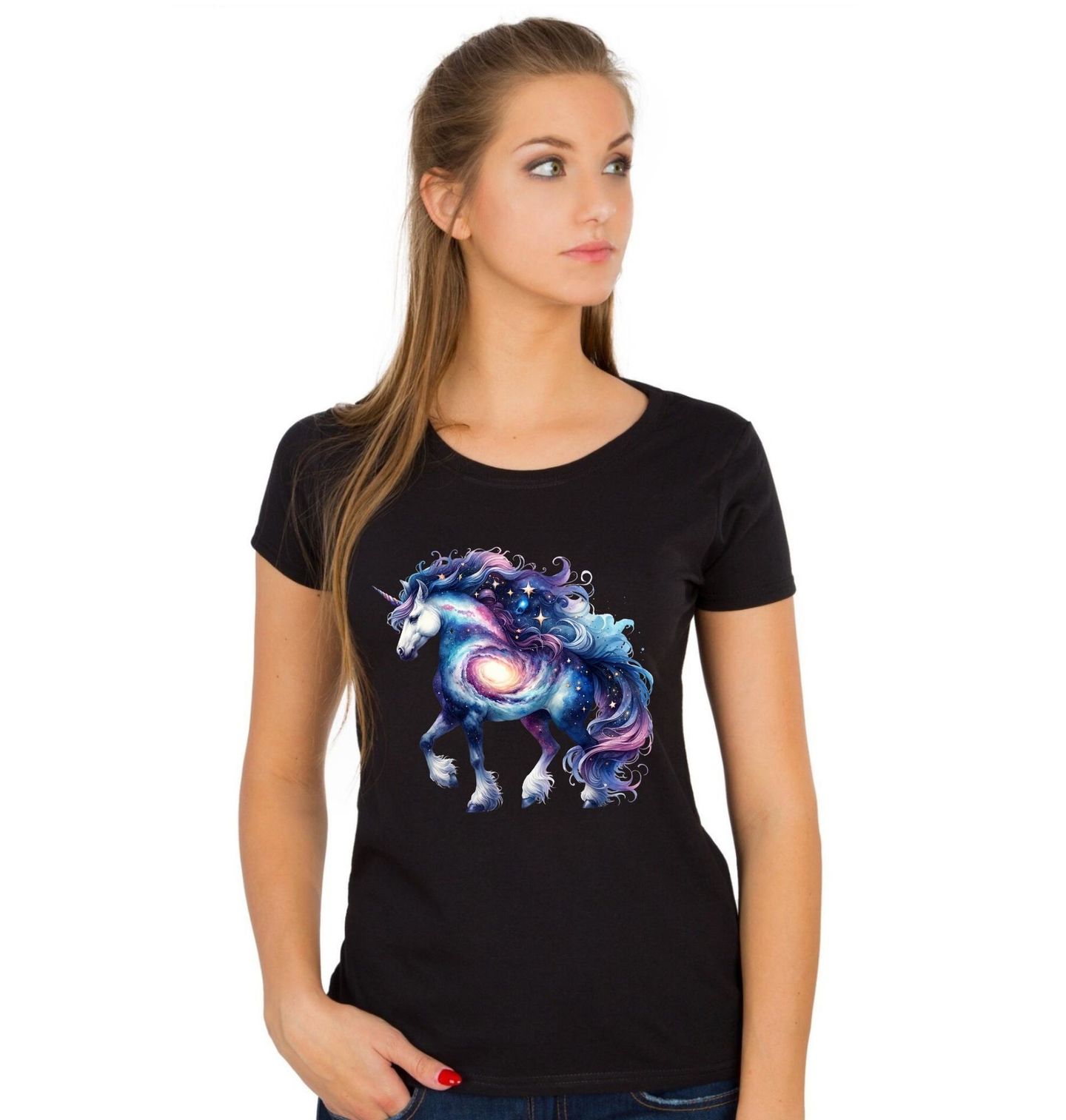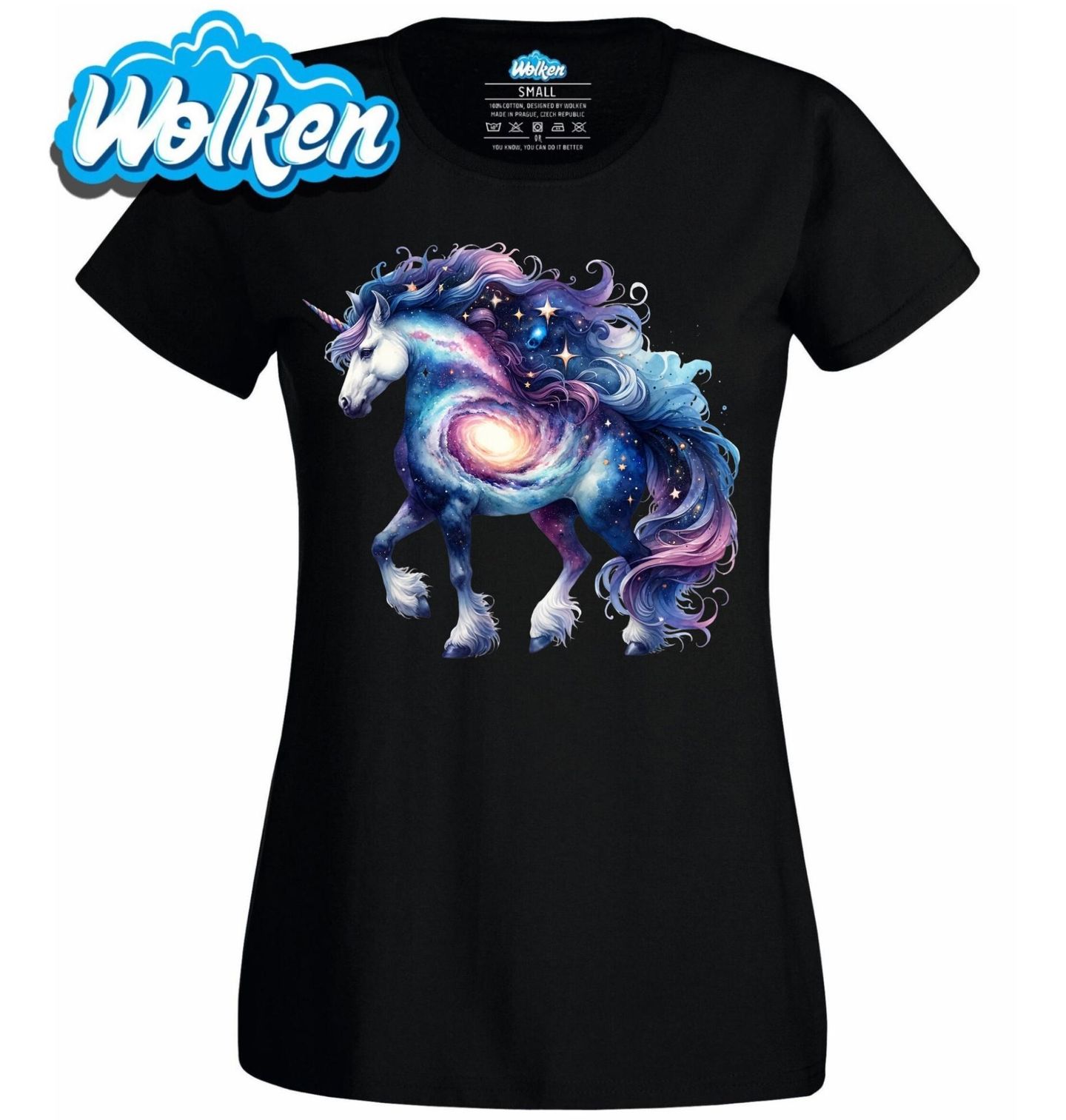 Dámské tričko Galaktický Jednorožec z Hvězdné Mlhoviny. Vstupte do vesmíru fantazie, kde jednorožec nese na svém těle celou galaxii! Tento úchvatný potisk s vesmírnými motivy, hvězdami a vírem galaxií je jako stvořený pro děti, které milují sny, hvězdy a pohádková stvoření.