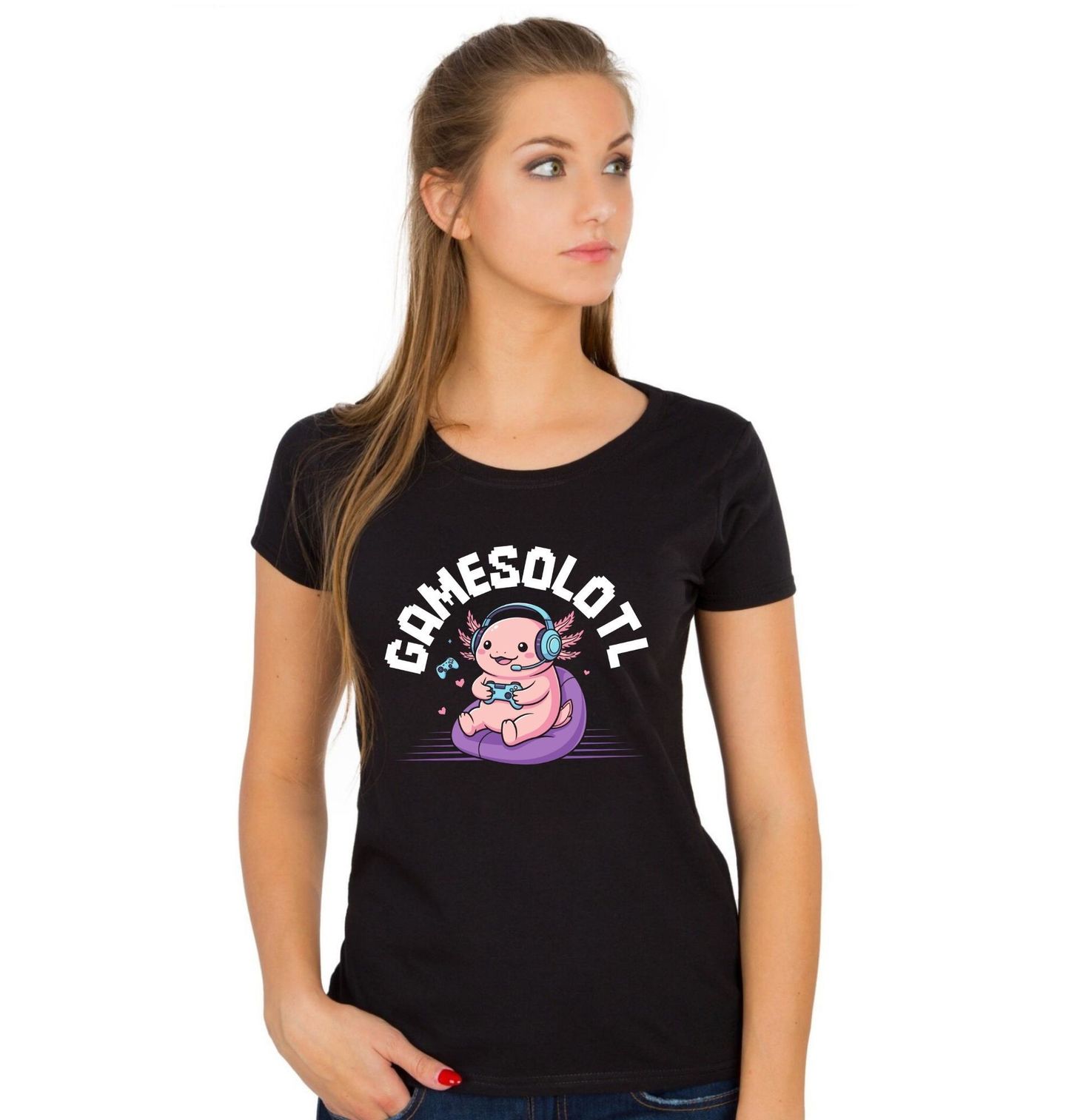 Dámské tričko Gamer Axolotl Gamesolotl. Roztomilý růžový axolotl pohodlně sedí na sedacím vaku, má na hlavě herní headset a v ručičkách drží herní ovladač. Tento axolotl je skutečný hráč a správný gamer! Nad motivem je anglický nápis „GAMESOLOTL“, což je slovní hříčka spojující slovo „game“ (hra) a „axolotl“.
