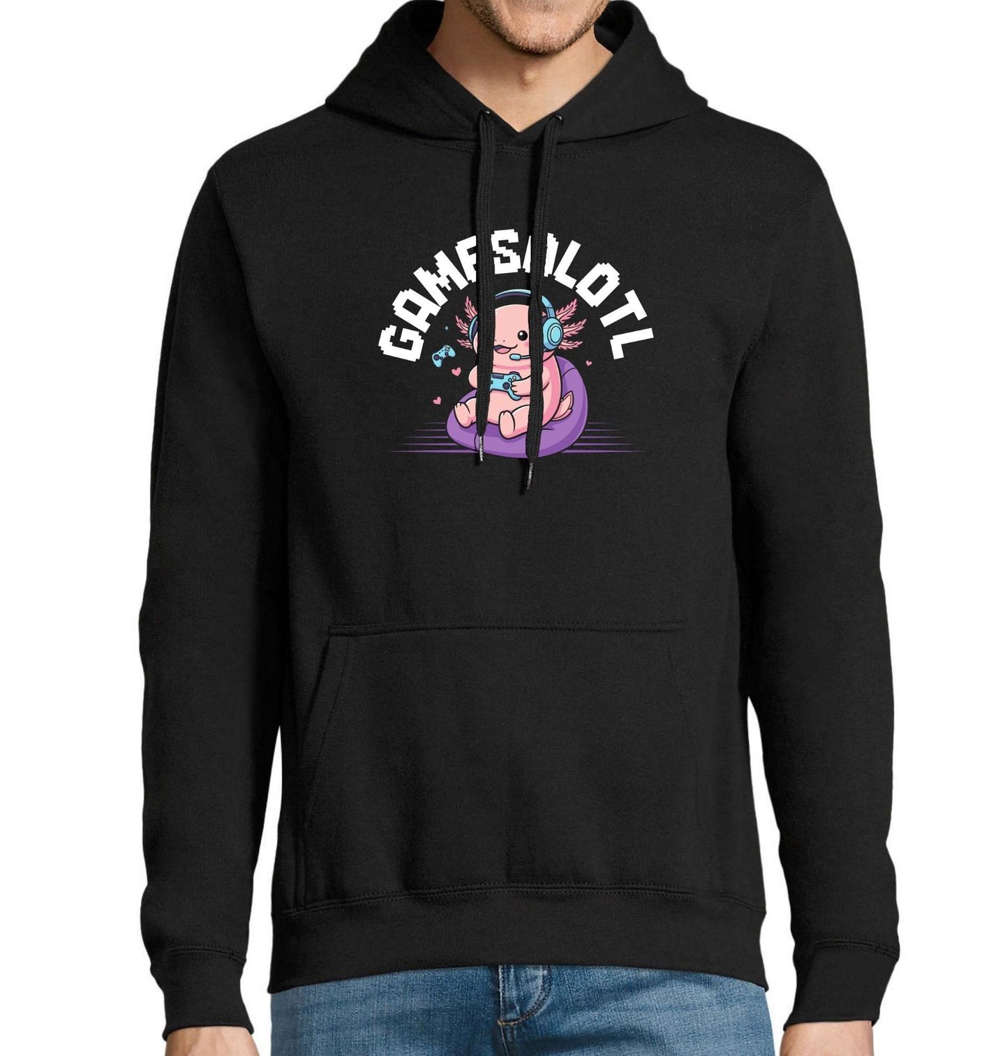 Pánská mikina Gamer Axolotl Gamesolotl. Roztomilý růžový axolotl pohodlně sedí na sedacím vaku, má na hlavě herní headset a v ručičkách drží herní ovladač. Tento axolotl je skutečný hráč a správný gamer! Nad motivem je anglický nápis „GAMESOLOTL“, což je slovní hříčka spojující slovo „game“ (hra) a „axolotl“.