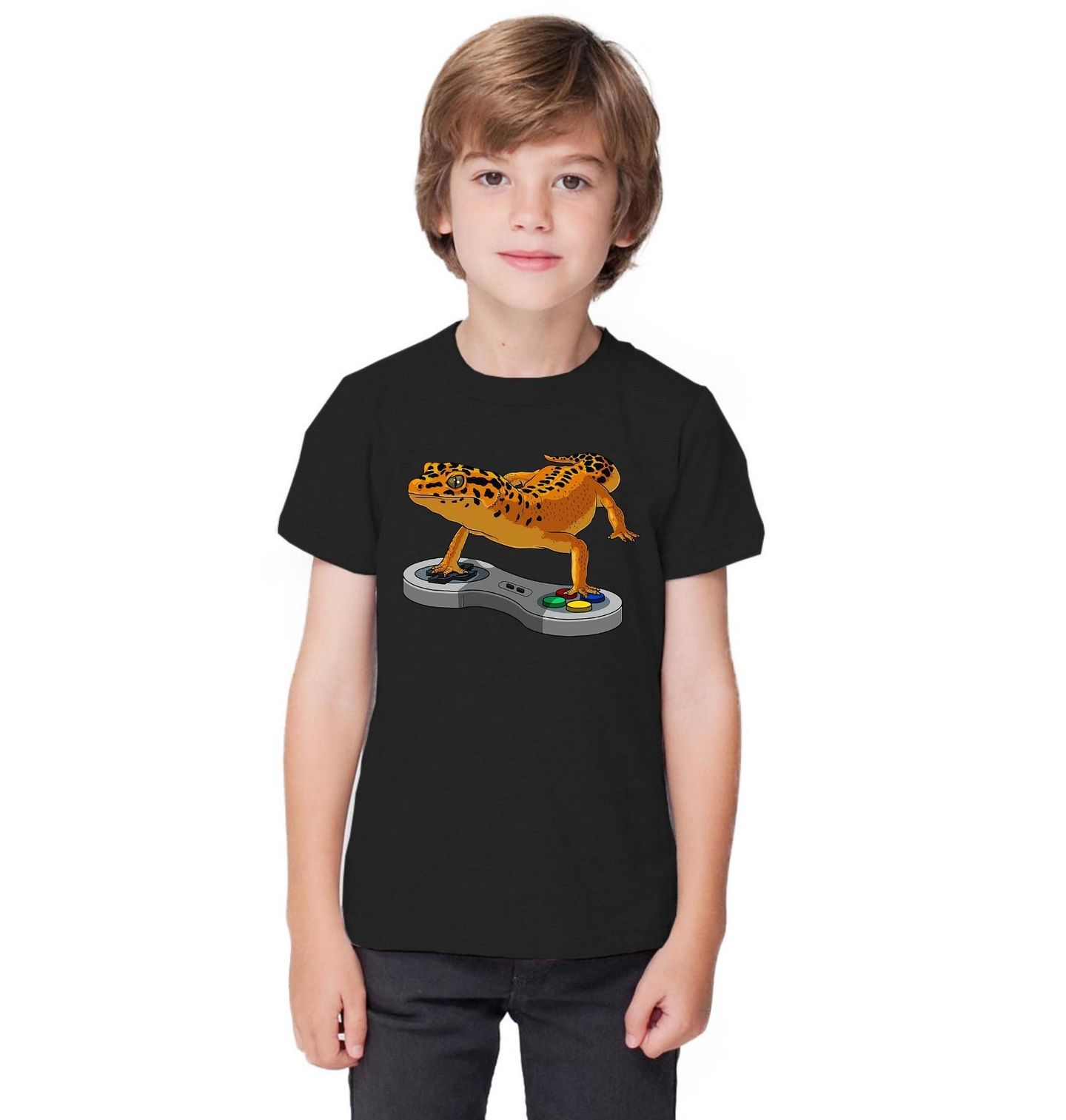 Dětské tričko Gamer Gekončík noční Leopard Gecko. Tento hravý motiv zobrazuje leopardího gekona sedícího na retro ovladači a připraveného ovládnout svět videohry. Motiv spojuje roztomilost plazů s herní nostalgií, takže je ideální volbou pro hráče, chovatele gekonů i každého, koho fascinuje ještěrka a videohry.