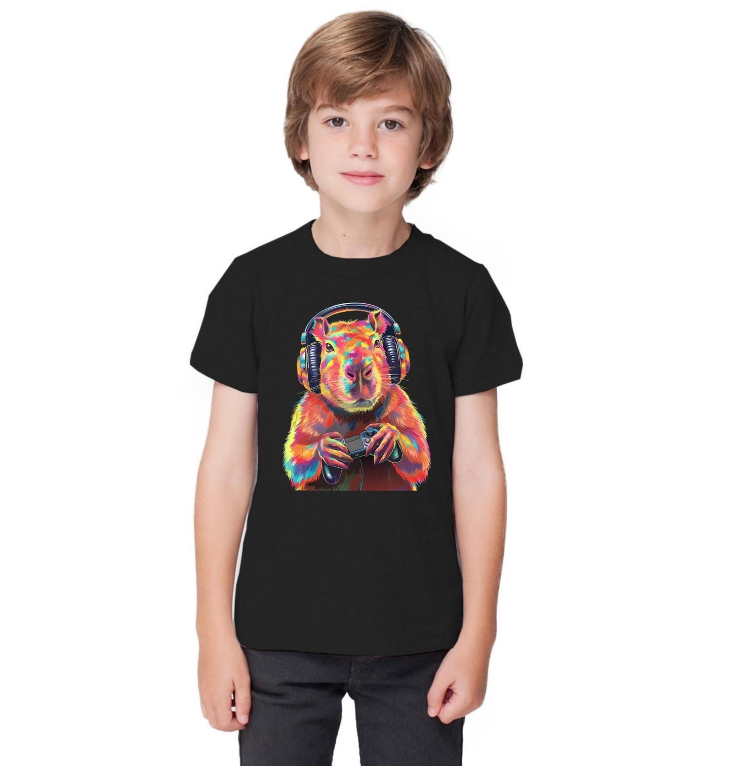 Dětské tričko Gamer Kapybara s Ovladačem. Stylový hlodavec s herním ovladačem a sluchátky v ruce (nebo spíš tlapkách) je připravená ovládnout herní svět! Tento barevně výrazný motiv spojuje chill energii kapybary s vášní každého hráče – ideální pro všechny, kdo berou hraní vážně, ale život s nadhledem.