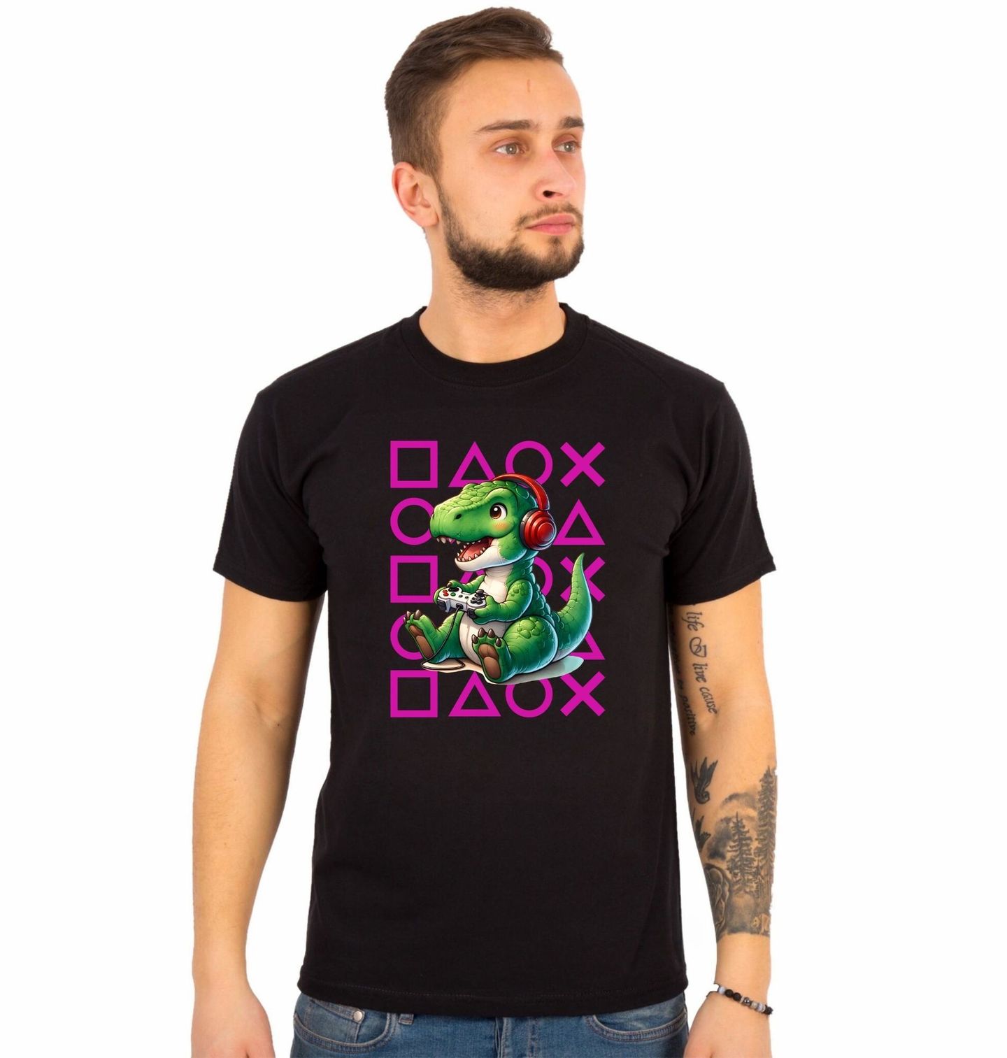 Pánské tričko Gaming Dinosarus T-Rex. Roztomilý motiv, na kterém sedí veselý dinosaurus s velkým úsměvem, na uších má sluchátka a v tlapkách drží ovladač. Ideální pro každého, kdo je srdcem hráč a pravý gamer. V pozadí jsou růžové herní symboly PlayStation – čtverec, trojúhelník, kroužek a křížek. Tyto ikony představují tlačítka na ovladači a krásně podtrhují herní atmosféru celého motivu.