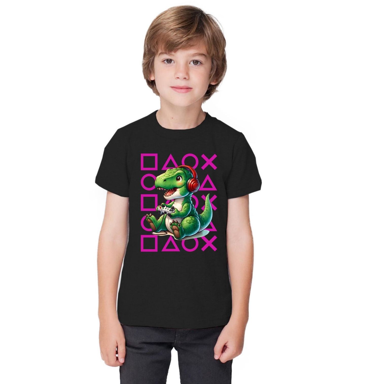 Dětské tričko Gaming Dinosarus T-Rex. Roztomilý motiv, na kterém sedí veselý dinosaurus s velkým úsměvem, na uších má sluchátka a v tlapkách drží ovladač. Ideální pro každého, kdo je srdcem hráč a pravý gamer. V pozadí jsou růžové herní symboly PlayStation – čtverec, trojúhelník, kroužek a křížek. Tyto ikony představují tlačítka na ovladači a krásně podtrhují herní atmosféru celého motivu.