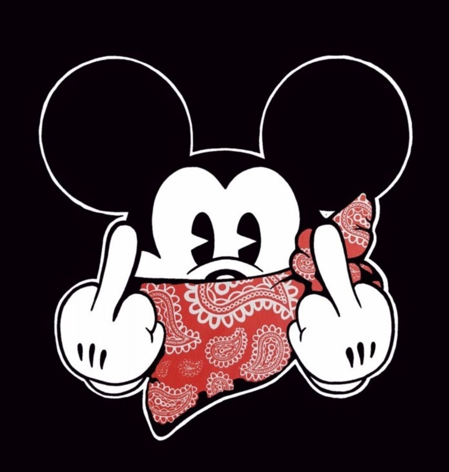 Dámské tričko Gangsta Mickey Mouse zobrazuje legendární první postavičku Walta Disneyho , Mickeyho Mouse, jako pouličního gangstera s rebelskou červenou bandanou a vztyčenými prostředníčky! Co Mickey zase provedl?
