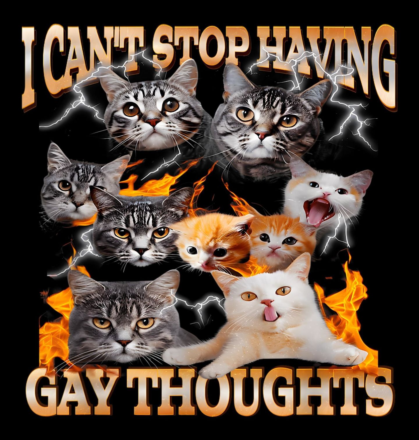 Dámské tričko Gay Kočka. „I can’t stop having gay thoughts“, což v překladu znamená „Nemůžu přestat mít gay myšlenky“. Tento motiv spojuje roztomilost koček s vtipnou a lehce provokativní hláškou, díky čemuž se stane perfektním kouskem do šatníku každého, kdo má rád kočky, sebeironii a originální styl.