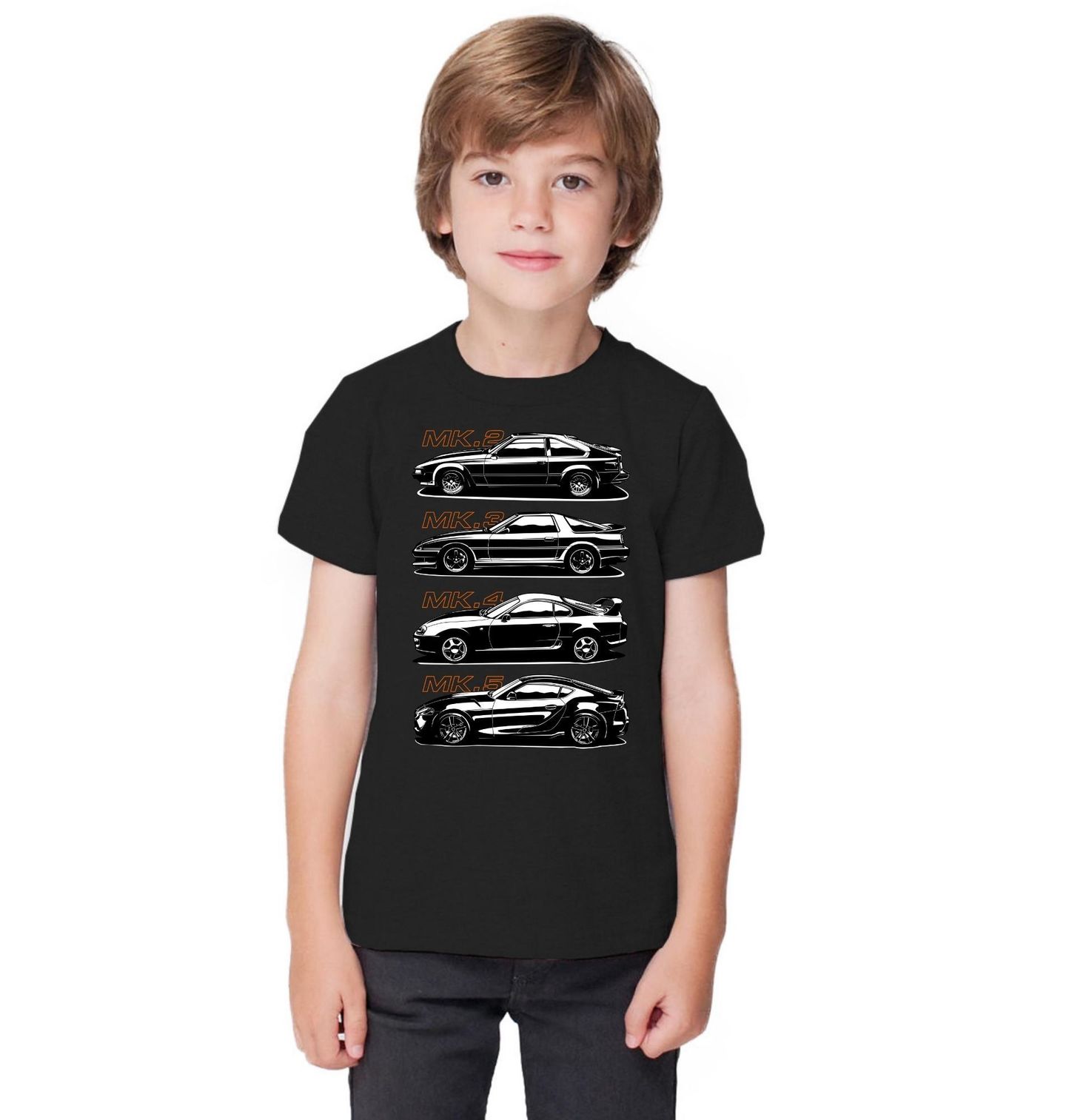 Dětské tričko Generace Toyota Supra MK.2 - MK.5. Na motivu je auto Toyota Supra, jedno z nejznámějších japonských sportovních aut všech dob. Každá generace přinesla vlastní styl a technologii – od hranaté klasiky MK2, přes futuristickou MK3, kultovní MK4 s legendárním motorem 2JZ až po moderní MK5. Supra se proslavila výkonem, možnostmi úprav a silnou komunitou fanoušků po celém světě.
