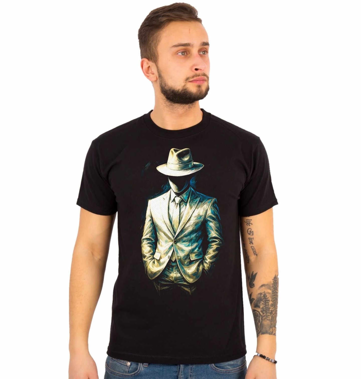 Pánské tričko Gentleman bez Tváře. Tajemný a elegantní motiv, který zobrazuje anonymní postavu v obleku a klobouku. Kdo to je? Muž bez identity, symbol skrytého já, síly a tajemství. Tento design nechává prostor fantazii – může to být kdokoliv… nebo nikdo. Minimalistické provedení v kombinaci s temnou atmosférou vytváří silný vizuální dojem. Postava působí sebevědomě, klidně a zároveň neuchopitelně. Kdo to je, zůstává otázkou – a právě v tom je jeho kouzlo.