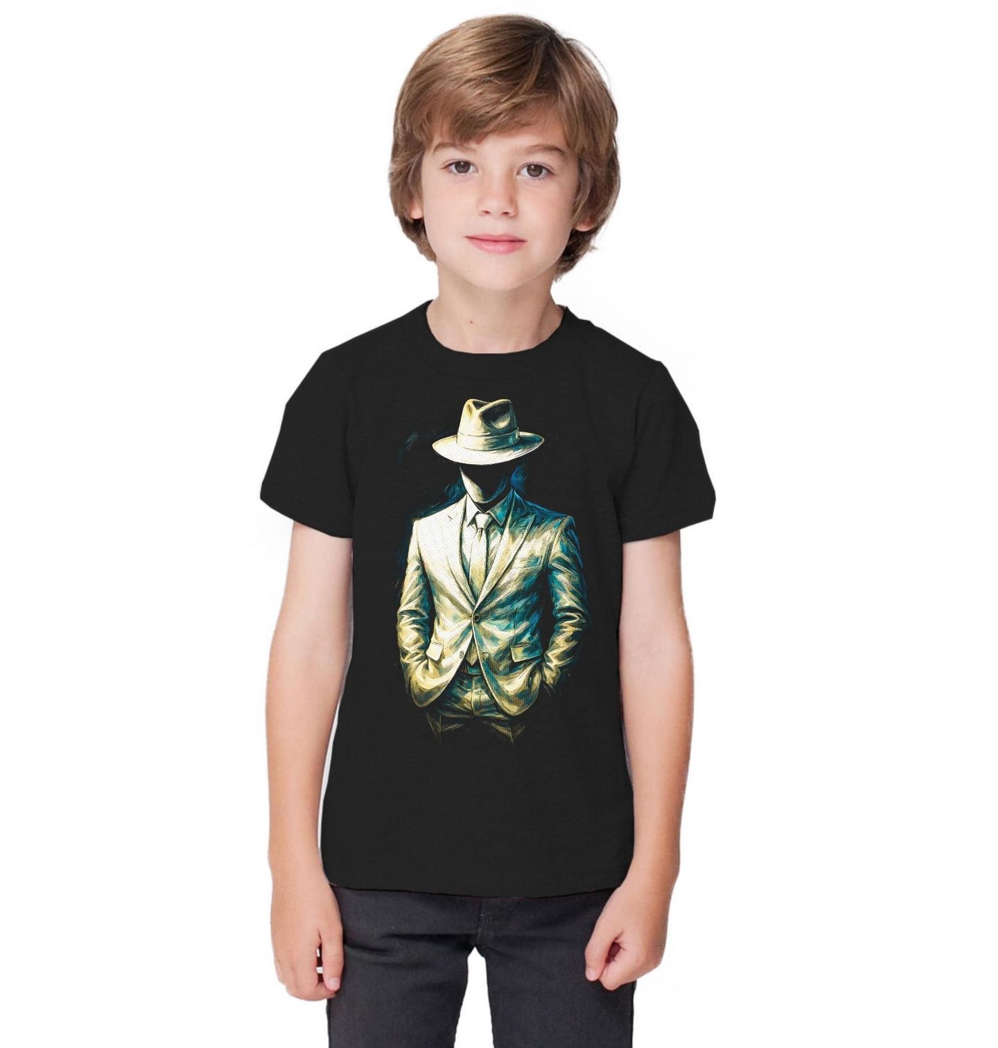 Dětské tričko Gentleman bez Tváře. Tajemný a elegantní motiv, který zobrazuje anonymní postavu v obleku a klobouku. Kdo to je? Muž bez identity, symbol skrytého já, síly a tajemství. Tento design nechává prostor fantazii – může to být kdokoliv… nebo nikdo. Minimalistické provedení v kombinaci s temnou atmosférou vytváří silný vizuální dojem. Postava působí sebevědomě, klidně a zároveň neuchopitelně. Kdo to je, zůstává otázkou – a právě v tom je jeho kouzlo.