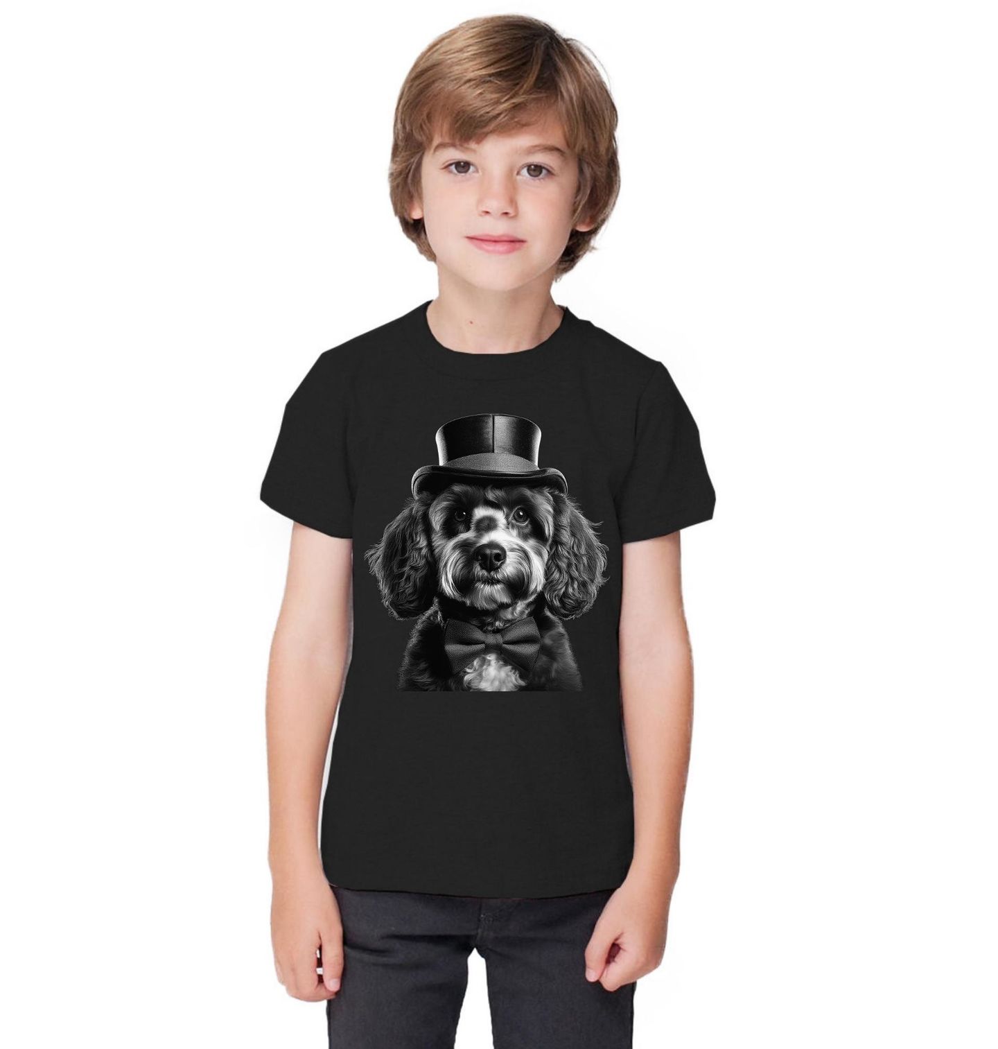 Dětské tričko Gentleman Cockapoo. Cockapoo je kříženec kokršpaněla a pudla. Stylový motiv, kde roztomilý Cockapoo vystupuje jako pravý elegán v klobouku a s motýlkem, zaujme každého milovníka psů. Tento originální design ocení každý pejskař, pro kterého je pes nejen mazlíček, ale i součást osobního stylu.