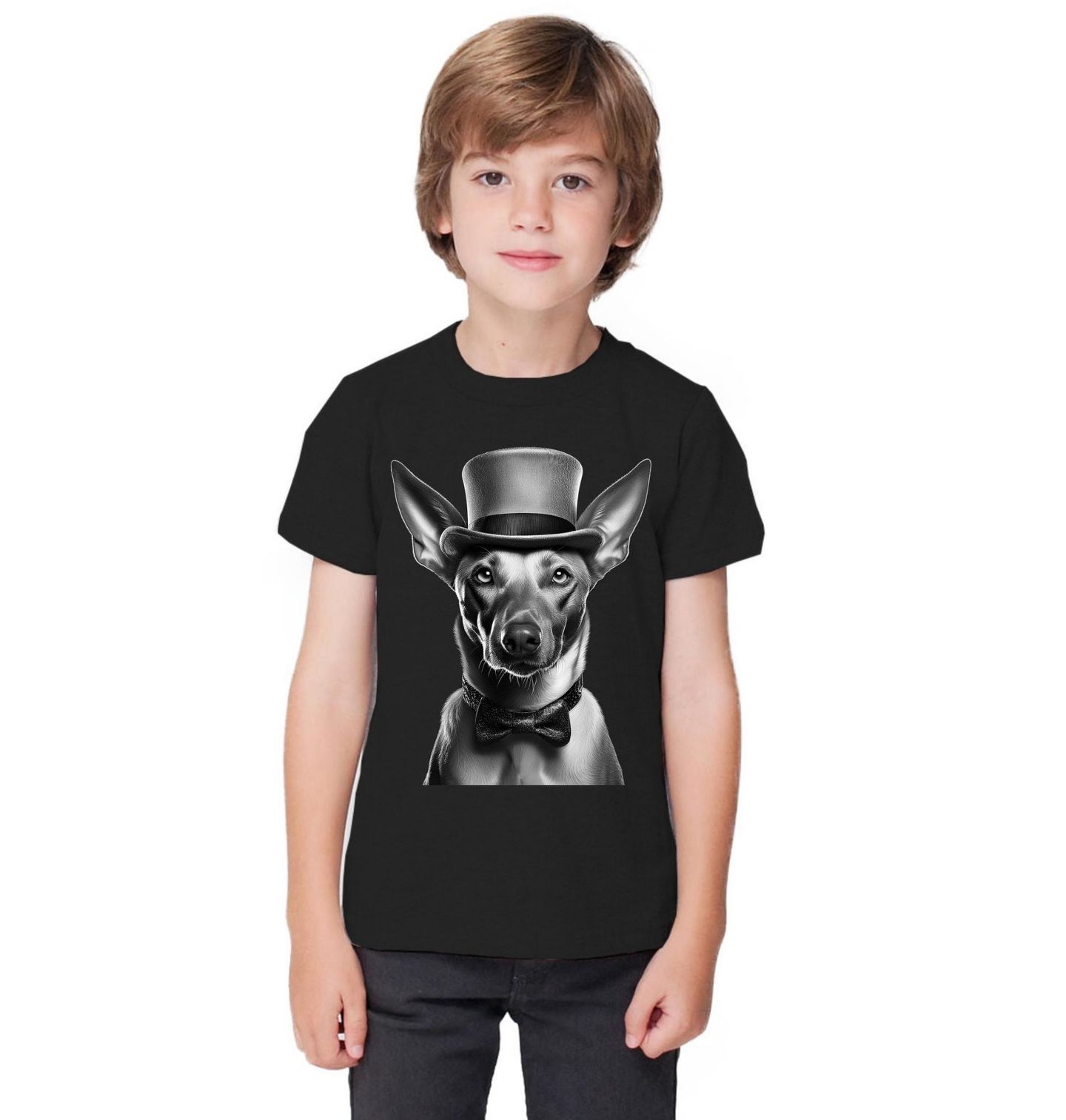 Dětské tričko Gentleman Faraonský pes. Faraonský pes je elegantní a hrdý pes, který zaujme na první pohled svou štíhlou postavou a ušlechtilým výrazem. Tento motiv zachycuje Faraonský pes v klobouku s motýlkem jako stylového gentlemana, který potěší každého milovníka originálních psích ilustrací. Každý pejskař ocení spojení noblesy a hravosti, které toto plemeno přirozeně vyzařuje.