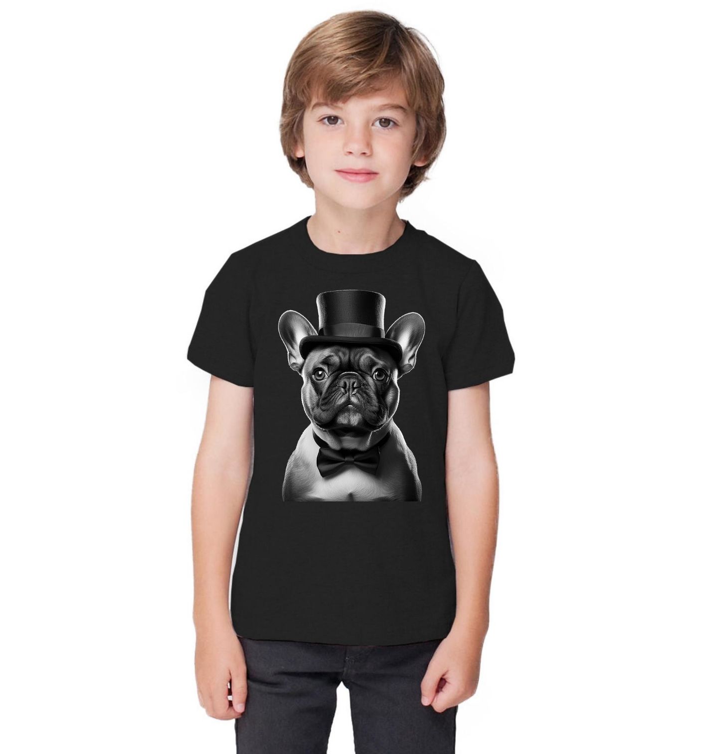 Dětské tričko Gentleman Francouzský buldoček. Stylový motiv, kde vystupuje Francouzský buldoček v klobouku a s motýlkem, potěší každého, pro koho je pes víc než jen domácí mazlíček. Elegantní vzhled dodává designu vtipný i noblesní charakter a zaujme každého, kdo je hrdý pejskař a miluje originální psí motivy.