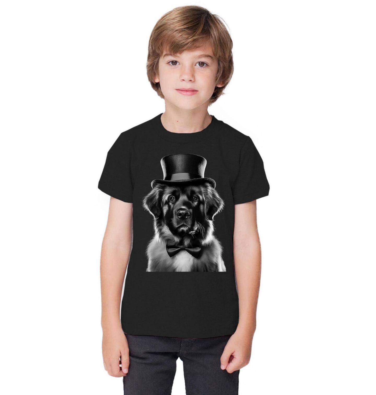 Dětské tričko Gentleman Leonberger. Elegantní motiv zachycuje plemeno Leonberger v originálním stylu s brýlemi a motýlkem, které dodávají celému vzhledu šmrnc a jemný humor. Tento majestátní pes působí sebevědomě a zároveň přátelsky, takže si získá pozornost každého, kdo má rád výrazný design se psí tematikou. Detailní zpracování ocení každý pejskař.