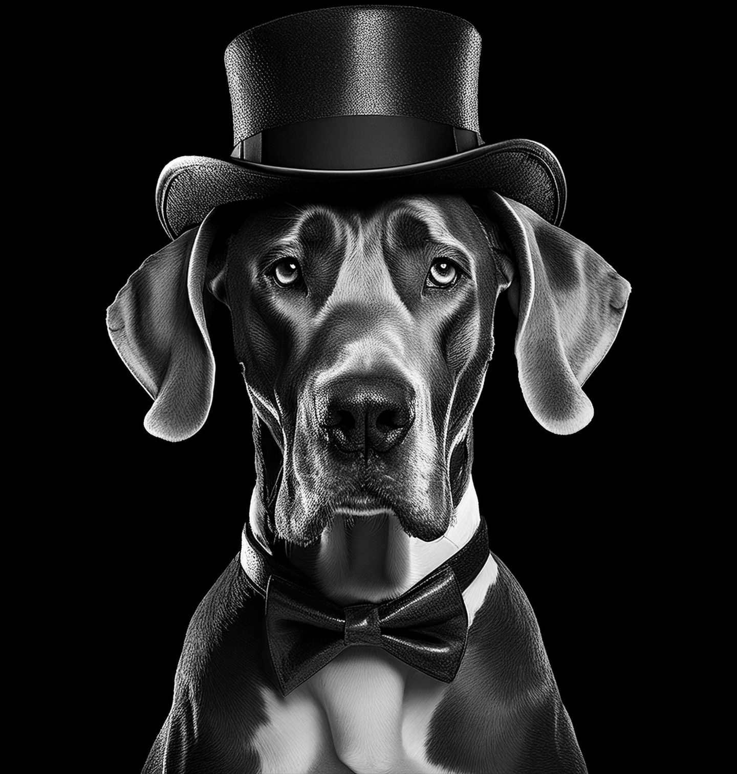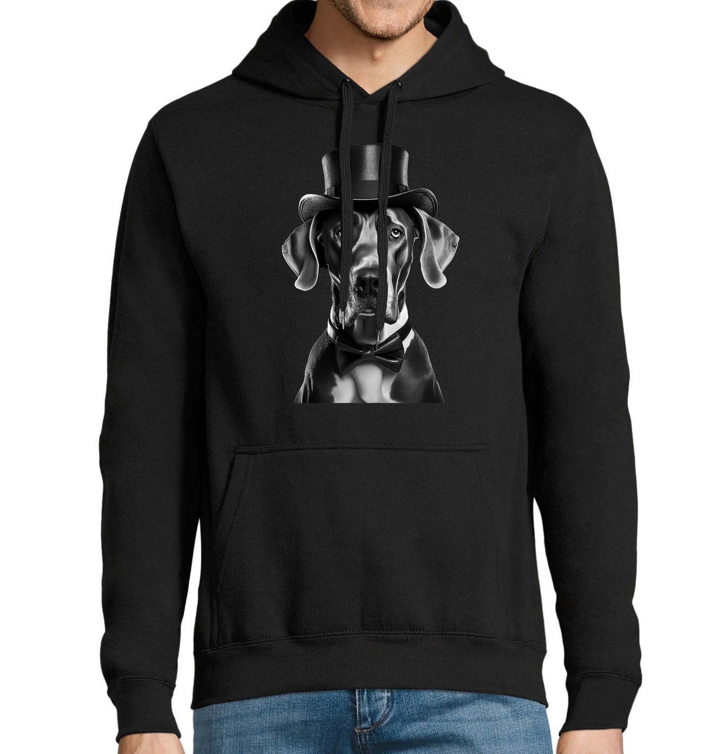 Pánská mikina Gentleman Německá doga. Elegantní motiv, kde dominuje Německá doga v klobouku s motýlkem, přináší spojení noblesy a jemného humoru. Tento stylový pes působí jako pravý gentleman a okamžitě zaujme každého, kdo miluje originální psí design. Každý pejskař, který obdivuje majestátní vzhled plemene Německá doga, ocení detailní zpracování i jedinečný charakter motivu.