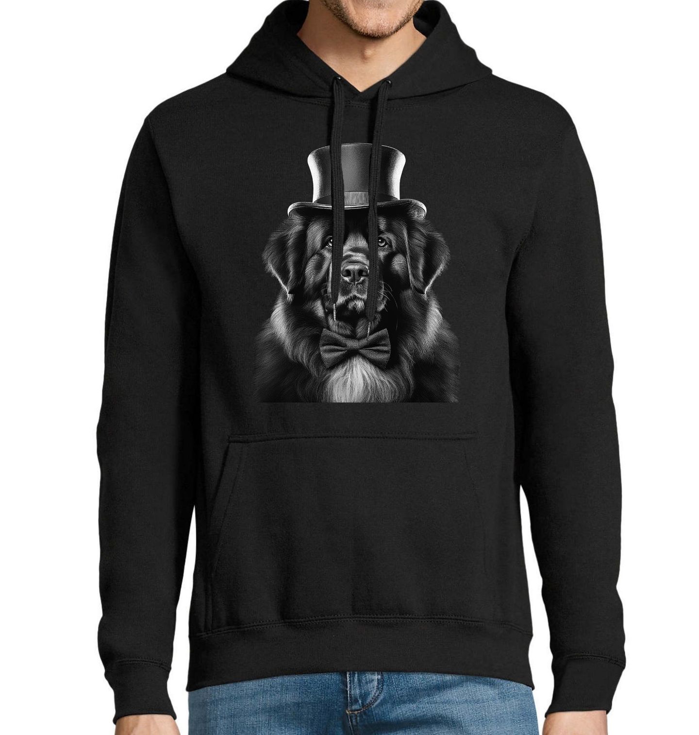 Pánská mikina Gentleman Novofundlandský pes. Stylový motiv zachycuje Novofundlandský pes v klobouku s motýlkem jako pravý elegán. Tento majestátní pes působí klidně, sebevědomě a zároveň přátelsky, což ocení každý milovník velkých plemen. Detailní zpracování zvýrazňuje charakteristický výraz, díky kterému je Novofundlandský pes nepřehlédnutelný.