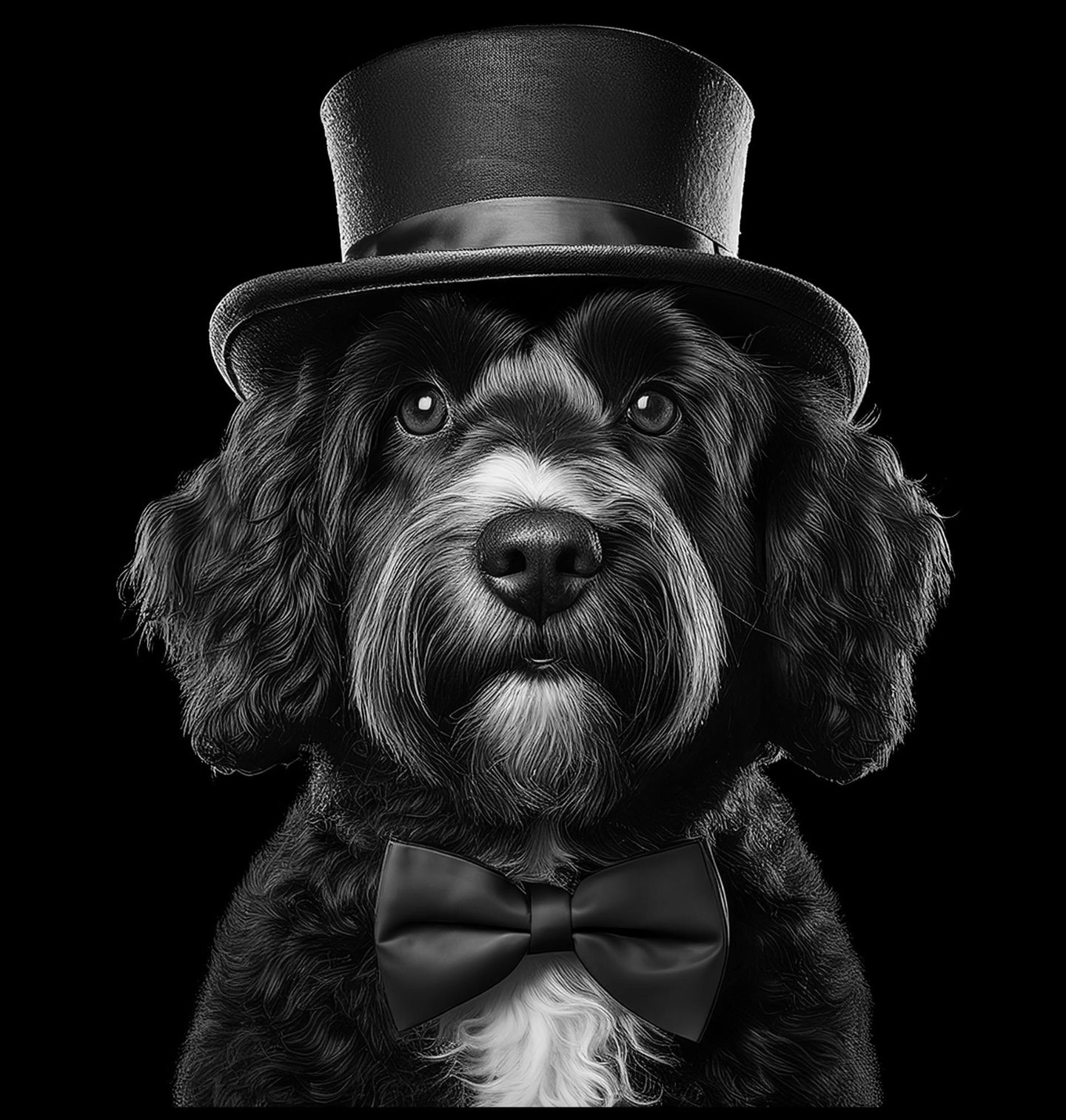 Dětské tričko Gentleman Portugalský vodní pes. Stylový motiv, kde Portugalský vodní pes v klobouku s motýlkem působí jako pravý elegán, zaujme každého milovníka psí noblesy. Tento originální design vystihuje, jak může být pes zároveň hravý i elegantní, a proto potěší každého, kdo je hrdý pejskař a obdivuje jedinečný vzhled plemene Portugalský vodní pes.