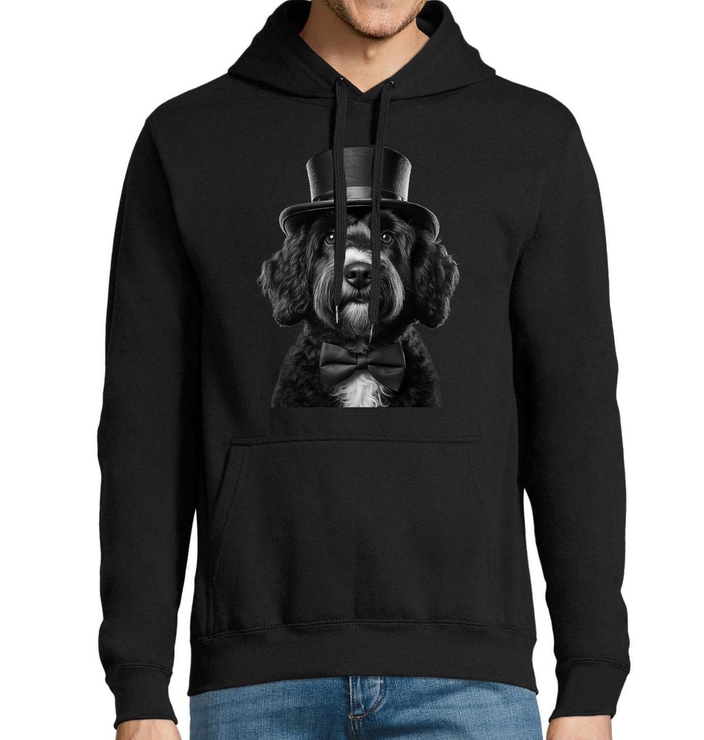 Pánská mikina Gentleman Portugalský vodní pes. Stylový motiv, kde Portugalský vodní pes v klobouku s motýlkem působí jako pravý elegán, zaujme každého milovníka psí noblesy. Tento originální design vystihuje, jak může být pes zároveň hravý i elegantní, a proto potěší každého, kdo je hrdý pejskař a obdivuje jedinečný vzhled plemene Portugalský vodní pes.