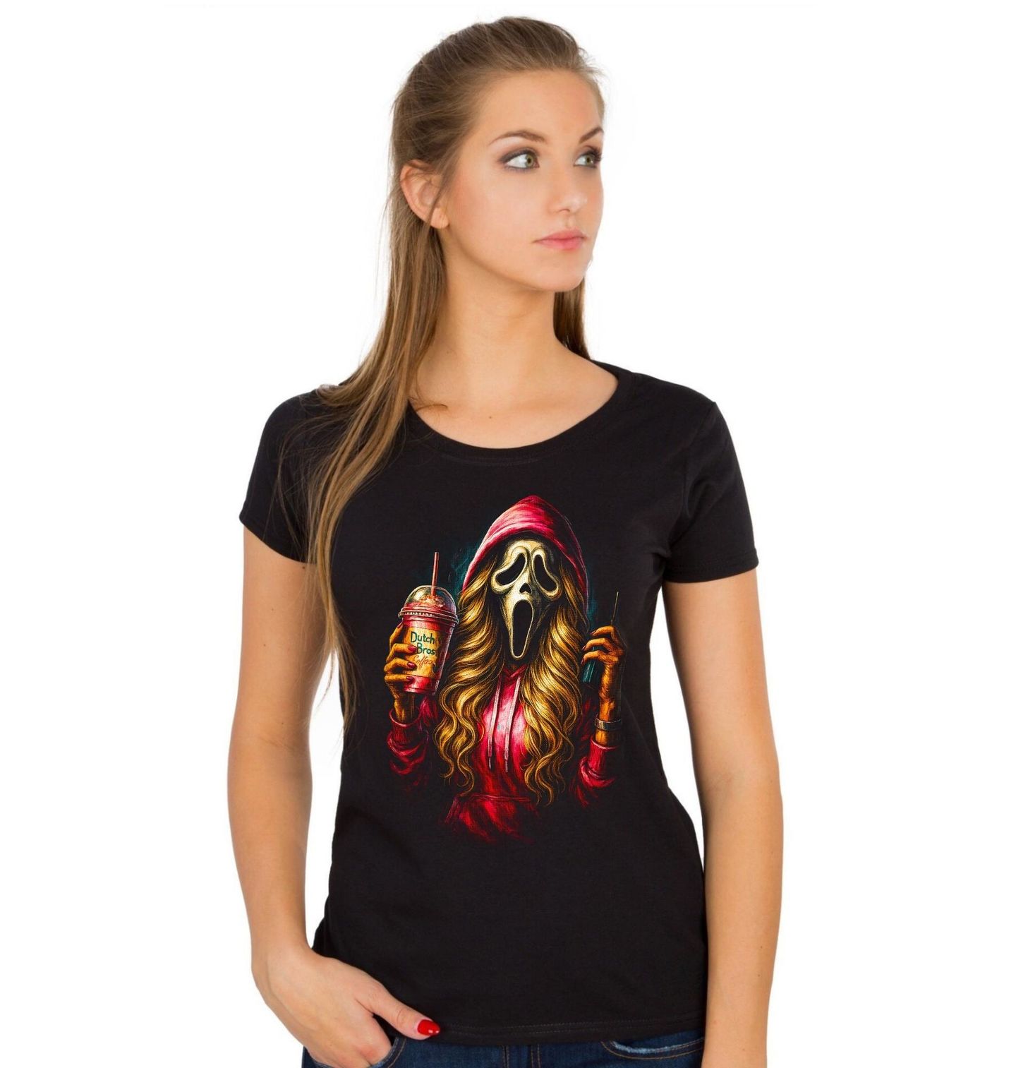 Dámské tričko Ghostface Girl. Styl, nadhled a lehká dávka hororu – tento originální motiv zachycuje Ghostface v netradiční podobě moderní girl boss postavy. Mikina, drink v ruce a ikonická maska vytváří kontrast mezi temnotou a pohodovým street stylem. Postava Ghostface pochází z legendární hororové série Scream, která se stala ikonou žánru. Tento design ji přetváří do současného stylu a přidává jí nový, odlehčený vibe.