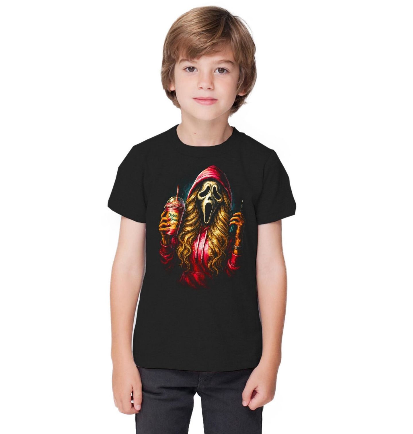Dětské tričko Ghostface Girl. Styl, nadhled a lehká dávka hororu – tento originální motiv zachycuje Ghostface v netradiční podobě moderní girl boss postavy. Mikina, drink v ruce a ikonická maska vytváří kontrast mezi temnotou a pohodovým street stylem. Postava Ghostface pochází z legendární hororové série Scream, která se stala ikonou žánru. Tento design ji přetváří do současného stylu a přidává jí nový, odlehčený vibe.