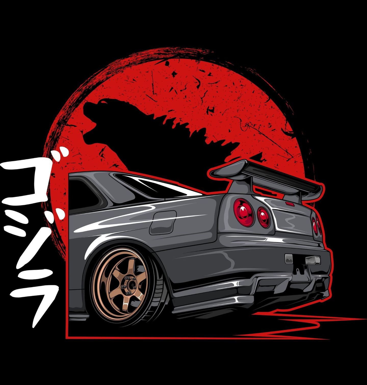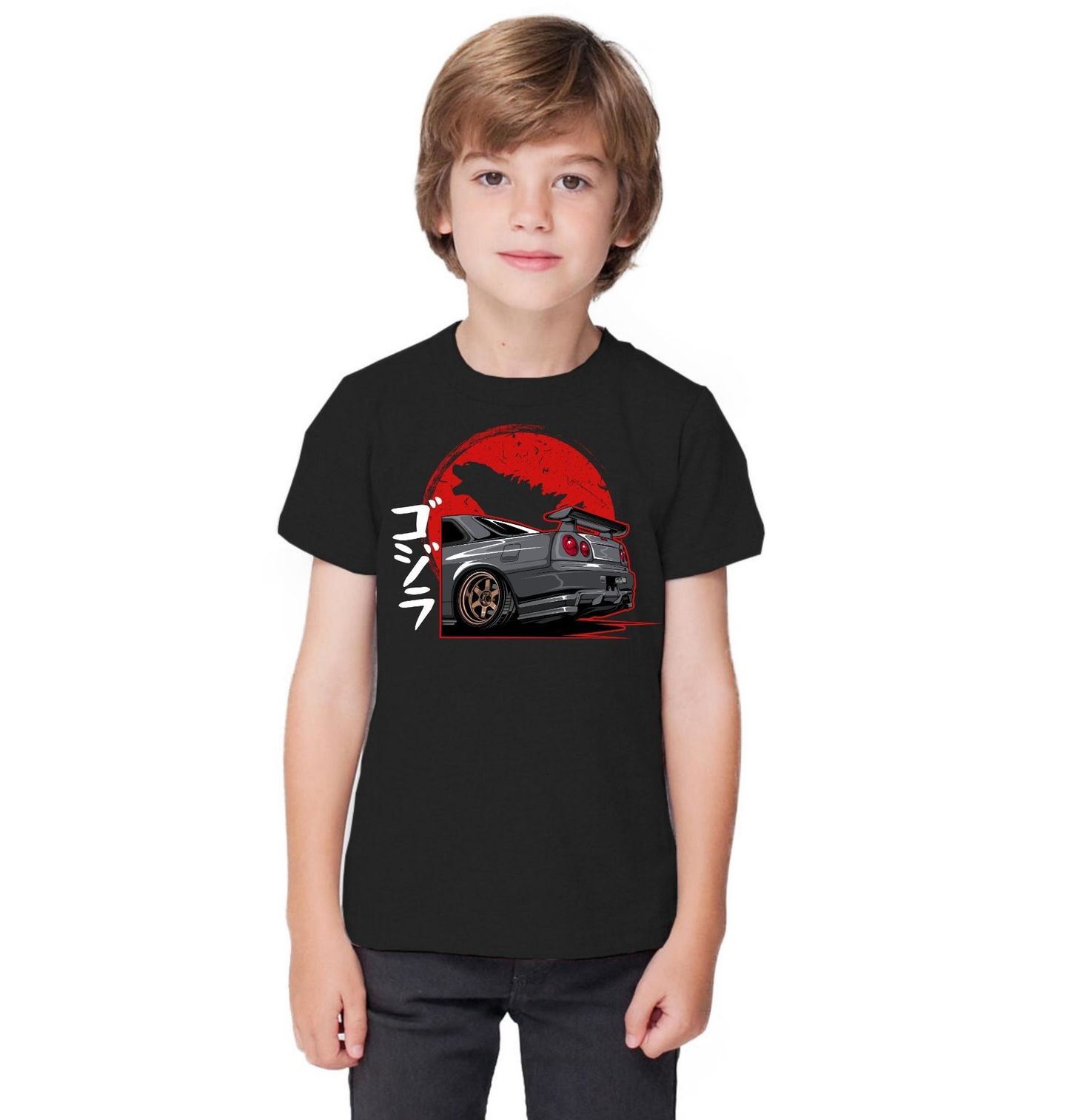 Dětské tričko Godzila Skyline. Na ilustraci je Nissan Skyline GT-R R34, sportovní vůz vyráběný v Japonsko na konci 90. let a začátku roku 2000. Přezdívku „godzila“ získal díky své dominanci na závodních tratích a extrémnímu výkonu, který překvapil celý svět. Pokud miluješ rychlé auto, výkon a atmosféru, kterou přináší Japonsko, tento motiv je ideální volba pro každodenní nošení i sběratelskou vášeň.