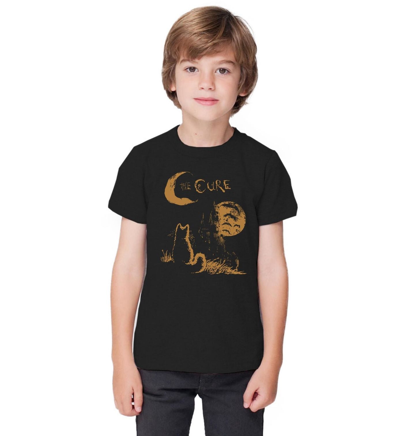 Dětské tričko Gotická Kočka The Cure. Tajemná kočka sedící pod zlatým měsícem, gotický hrad a melancholická atmosféra – tento motiv je stylovou poctou legendární kapele The Cure. Ideální pro milovníky temné romantiky, alternativní hudby a nočních nálad. Design, který propojuje sílu symboliky s estetikou 80. let.
