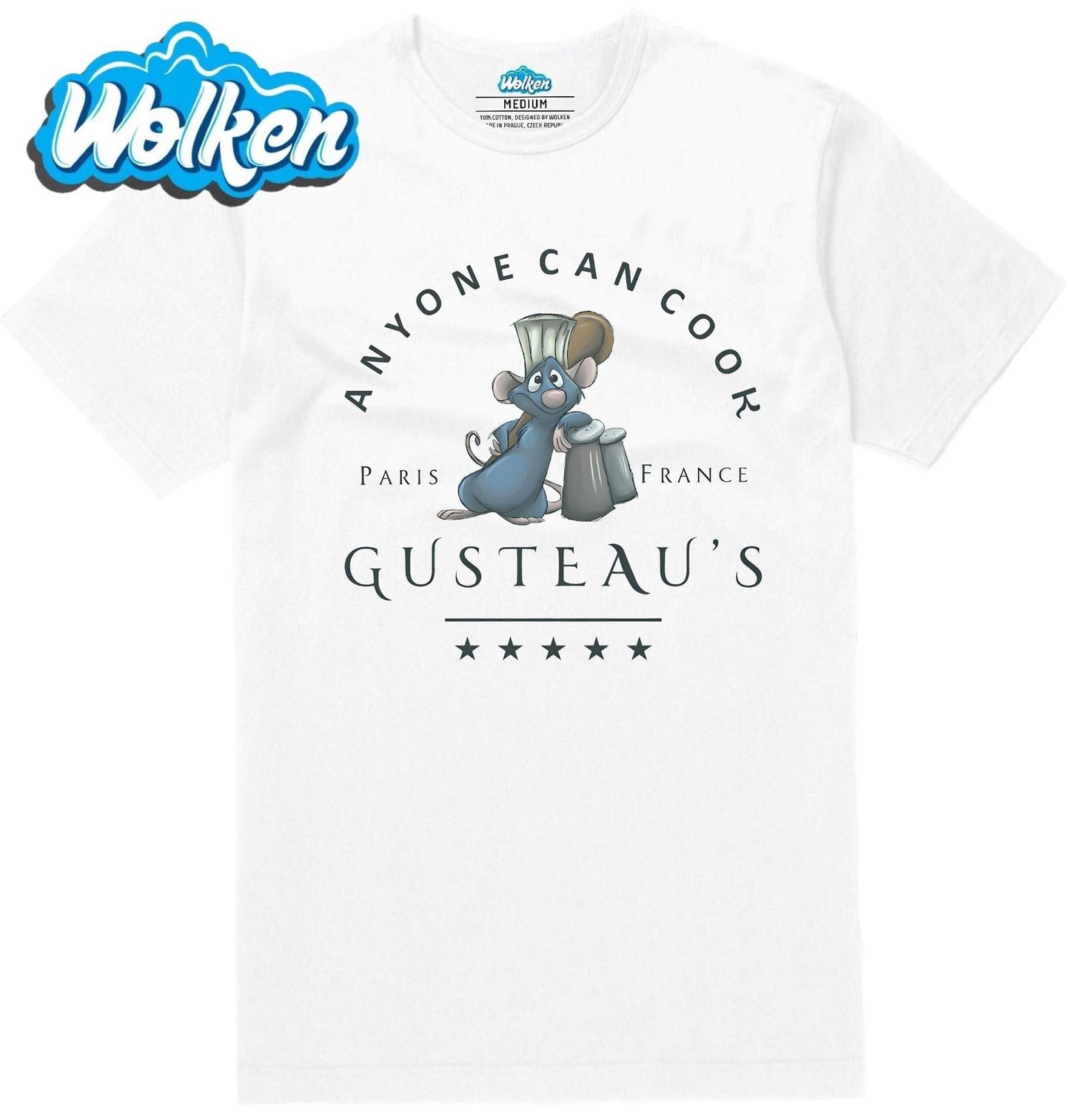 Pánské tričko Gusteau’s Každý může vařit. Ten motiv vychází z postavičky Remyho z animovaného filmu Ratatouille od Pixaru. Ratatouille je též francouzský pokrm – dušená zelenina s bylinkami. Myš v kuchařské čepici s citátem „Anyone can cook“ („Každý může vařit“) a pod tím nápis „Gusteau’s – Paris France“ s pěti hvězdičkami, což odkazuje na slavnou restauraci.