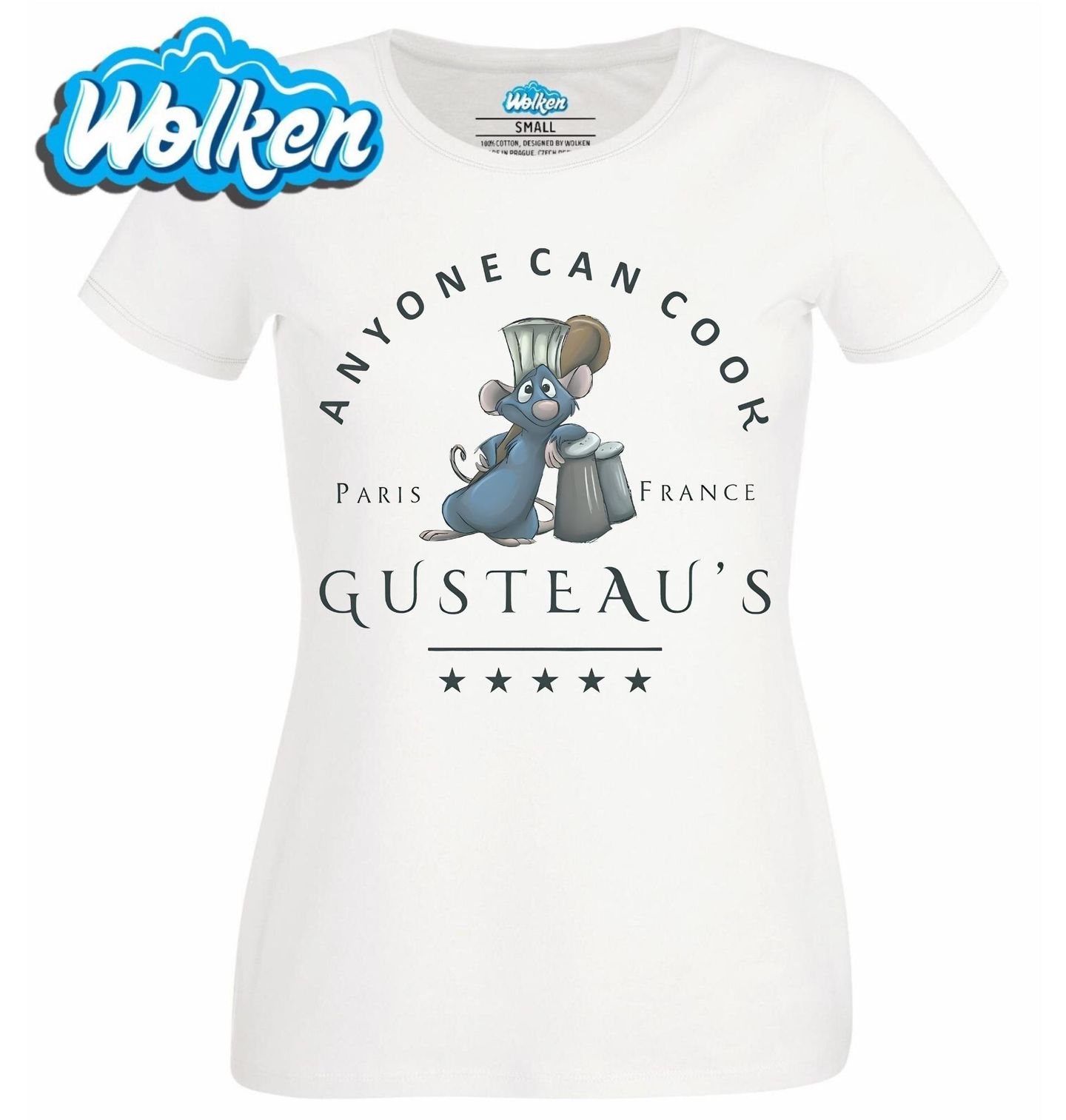 Dámské tričko Gusteau’s Každý může vařit. Ten motiv vychází z postavičky Remyho z animovaného filmu Ratatouille od Pixaru. Ratatouille je též francouzský pokrm – dušená zelenina s bylinkami. Myš v kuchařské čepici s citátem „Anyone can cook“ („Každý může vařit“) a pod tím nápis „Gusteau’s – Paris France“ s pěti hvězdičkami, což odkazuje na slavnou restauraci.