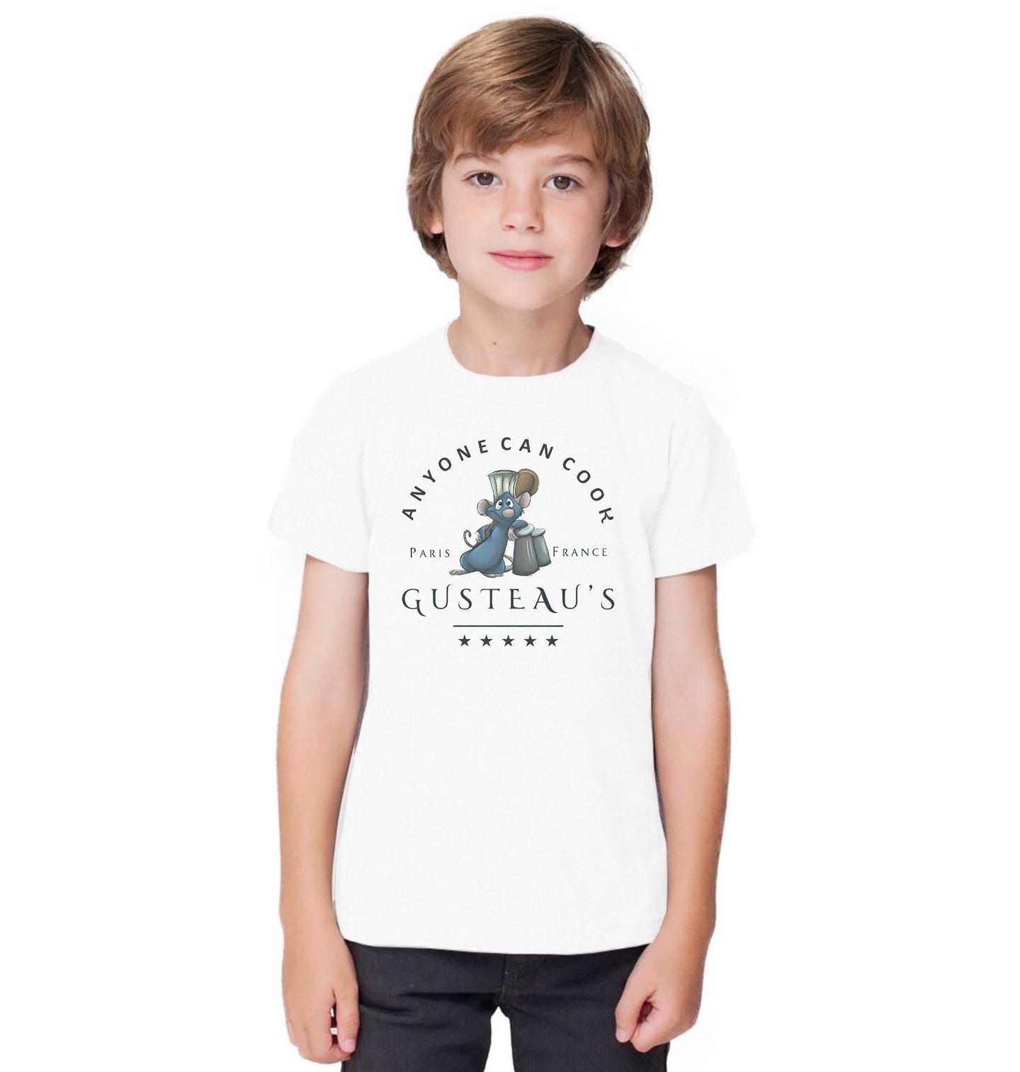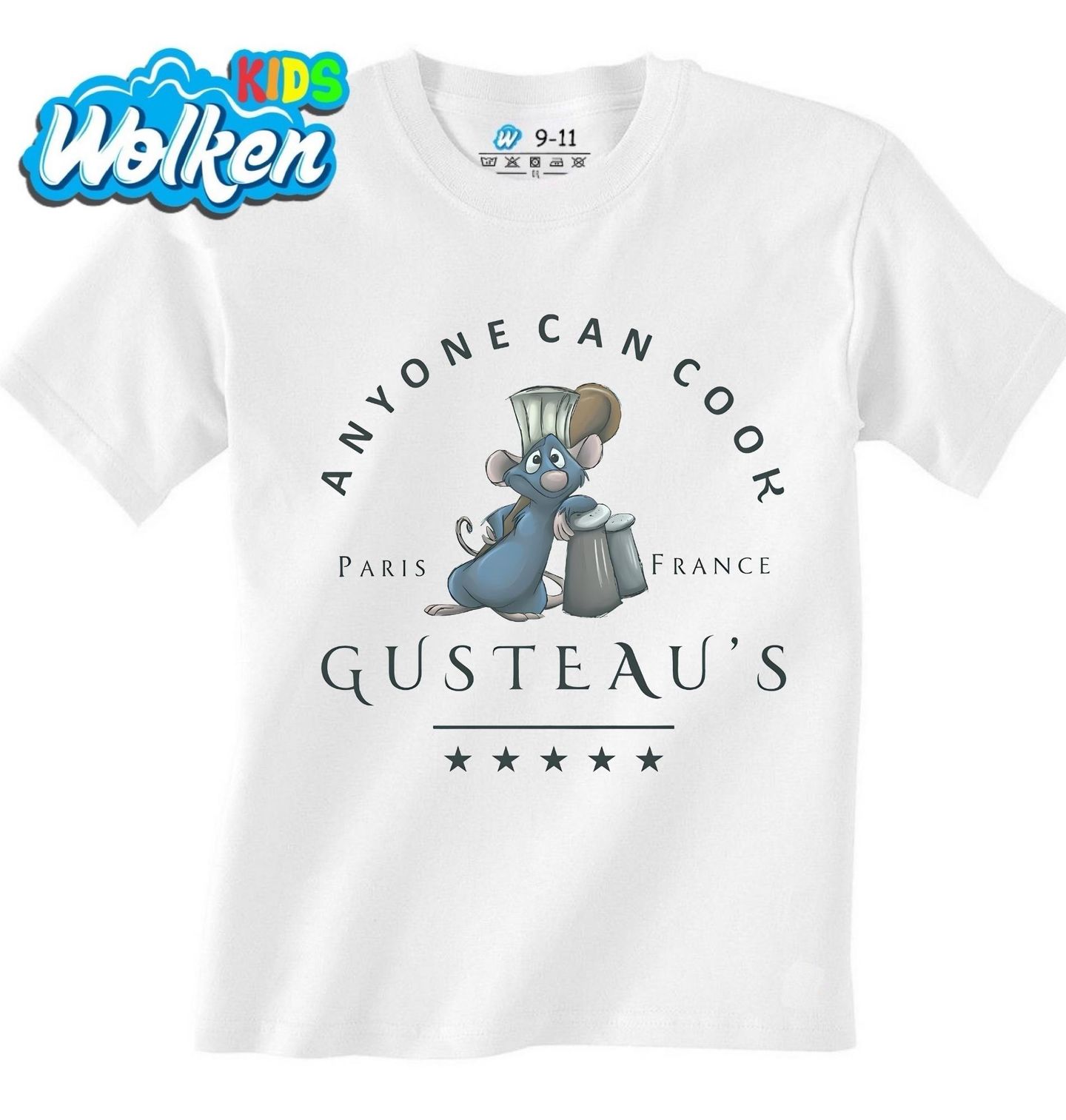 Dětské tričko Gusteau’s Každý může vařit. Ten motiv vychází z postavičky Remyho z animovaného filmu Ratatouille od Pixaru. Ratatouille je též francouzský pokrm – dušená zelenina s bylinkami. Myš v kuchařské čepici s citátem „Anyone can cook“ („Každý může vařit“) a pod tím nápis „Gusteau’s – Paris France“ s pěti hvězdičkami, což odkazuje na slavnou restauraci.