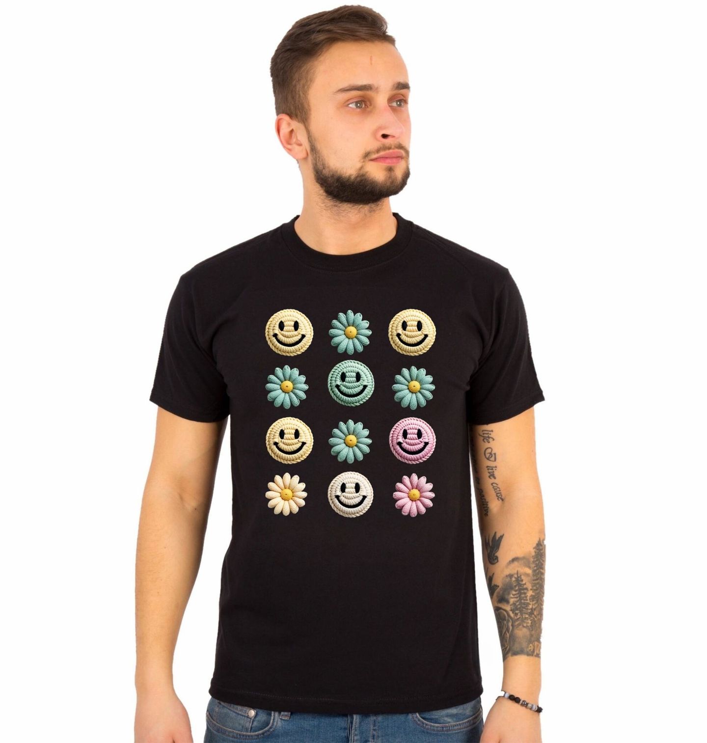 Pánské tričko Háčkovaná Emoji Koláž Květin. Motiv je vytištěný potiskem – nejedná se o výšivku ani háčkovaný 3D prvek! Veselý motiv, který spojuje barevné květiny, stylové smajlíky do jedné originální kompozice. Tato moderní koláž působí hravě a pozitivně, takže je ideální pro každého, kdo chce do svého outfitu přidat dobrou náladu a jemný retro nádech.
