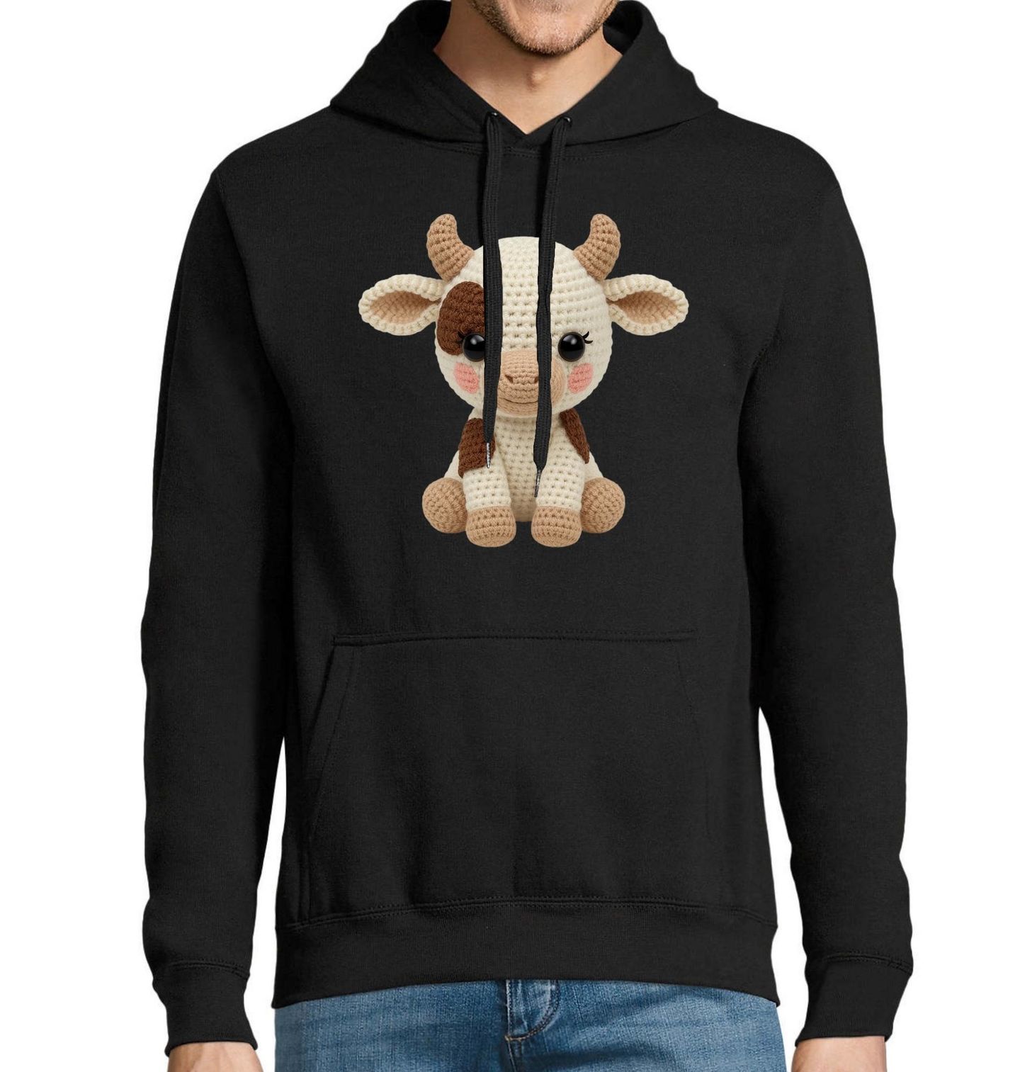 Pánská mikina Háčkovaná Kráva. Motiv je vytištěný potiskem – nejedná se o výšivku ani háčkovaný 3D prvek! Milý a hravý design, ve kterém hlavní roli hraje roztomilá kráva ve stylu háčkované plyšové hračky. Jemné barvy, velké oči a detailní struktura vytvářejí něžný motiv, který zaujme děti i dospělé milovníky zvířat.