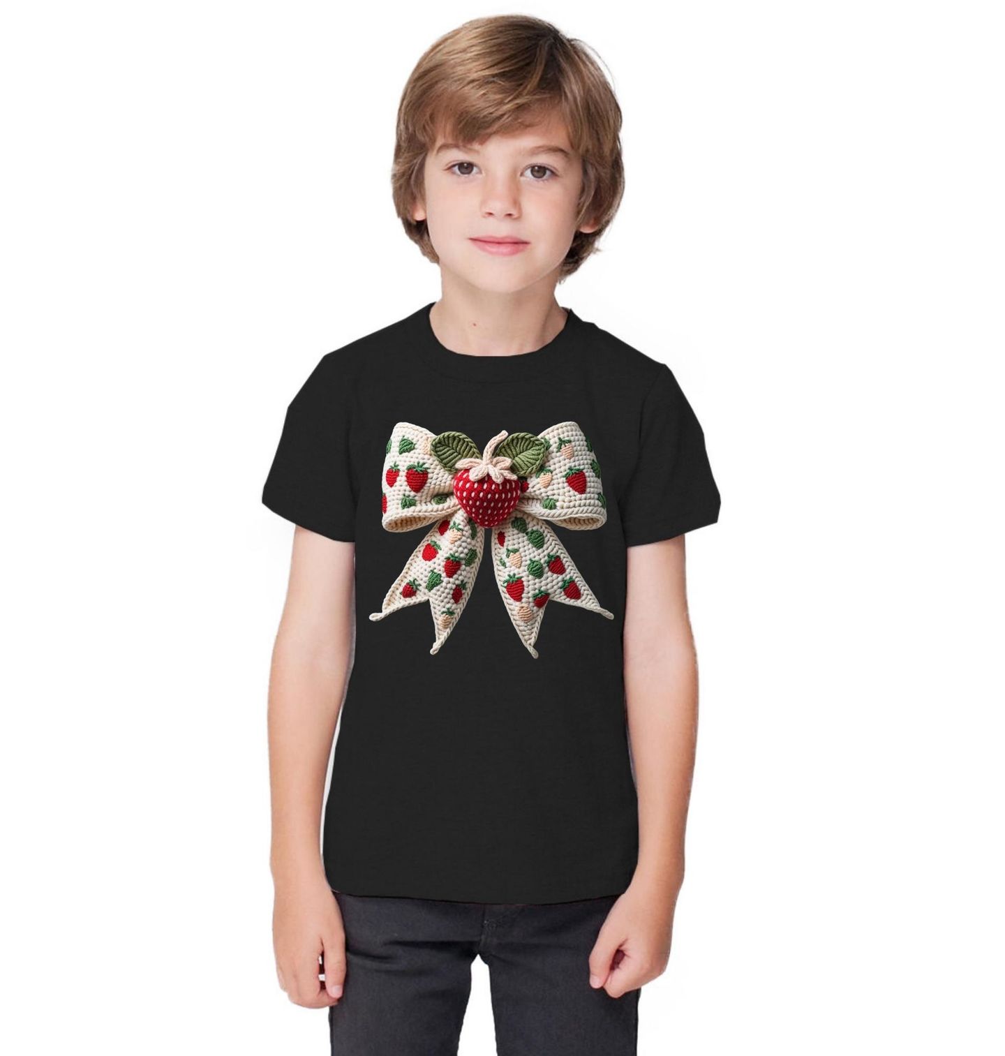Dětské tričko Háčkovaná Mašle s Jahodou. Motiv je vytištěný potiskem – nejedná se o výšivku ani háčkovaný 3D prvek! Něžný a hravý motiv, kde hlavní roli hraje stylová mašle doplněná ovocným vzorem. Dominantou designu je roztomilá jahoda, která dodává celému vzhledu sladký a letní nádech.