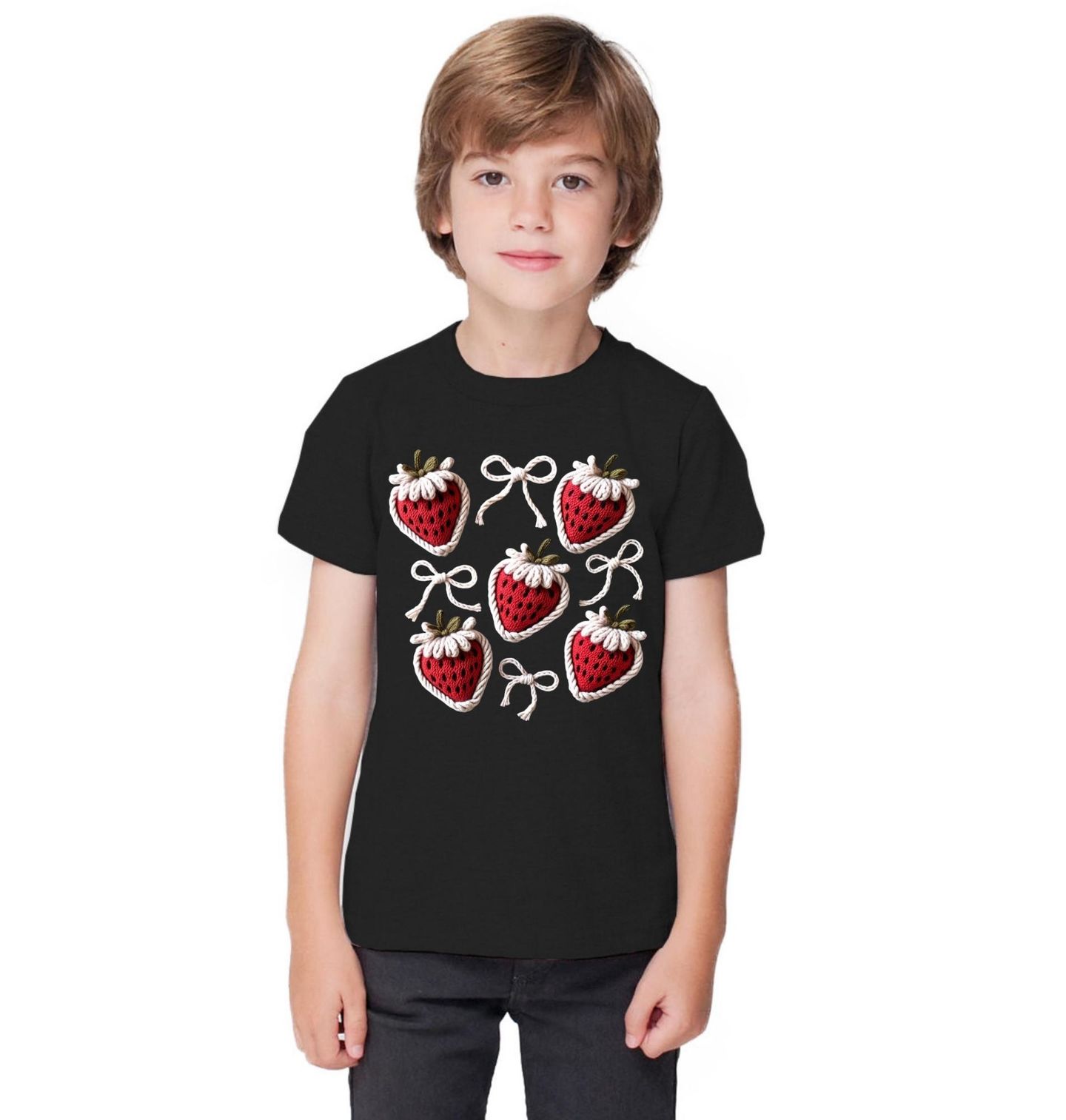 Dětské tričko Háčkované Jahody. Motiv je vytištěný potiskem – nejedná se o výšivku ani háčkovaný 3D prvek! Hravý a originální design inspirovaný ruční tvorbou, kde hlavní roli hraje roztomilá pletená jahoda doplněná jemnými mašličkami. Tento motiv působí sladce, něžně a zároveň stylově, takže je ideální pro všechny milovníky přírody, ovoce a handmade estetiky.