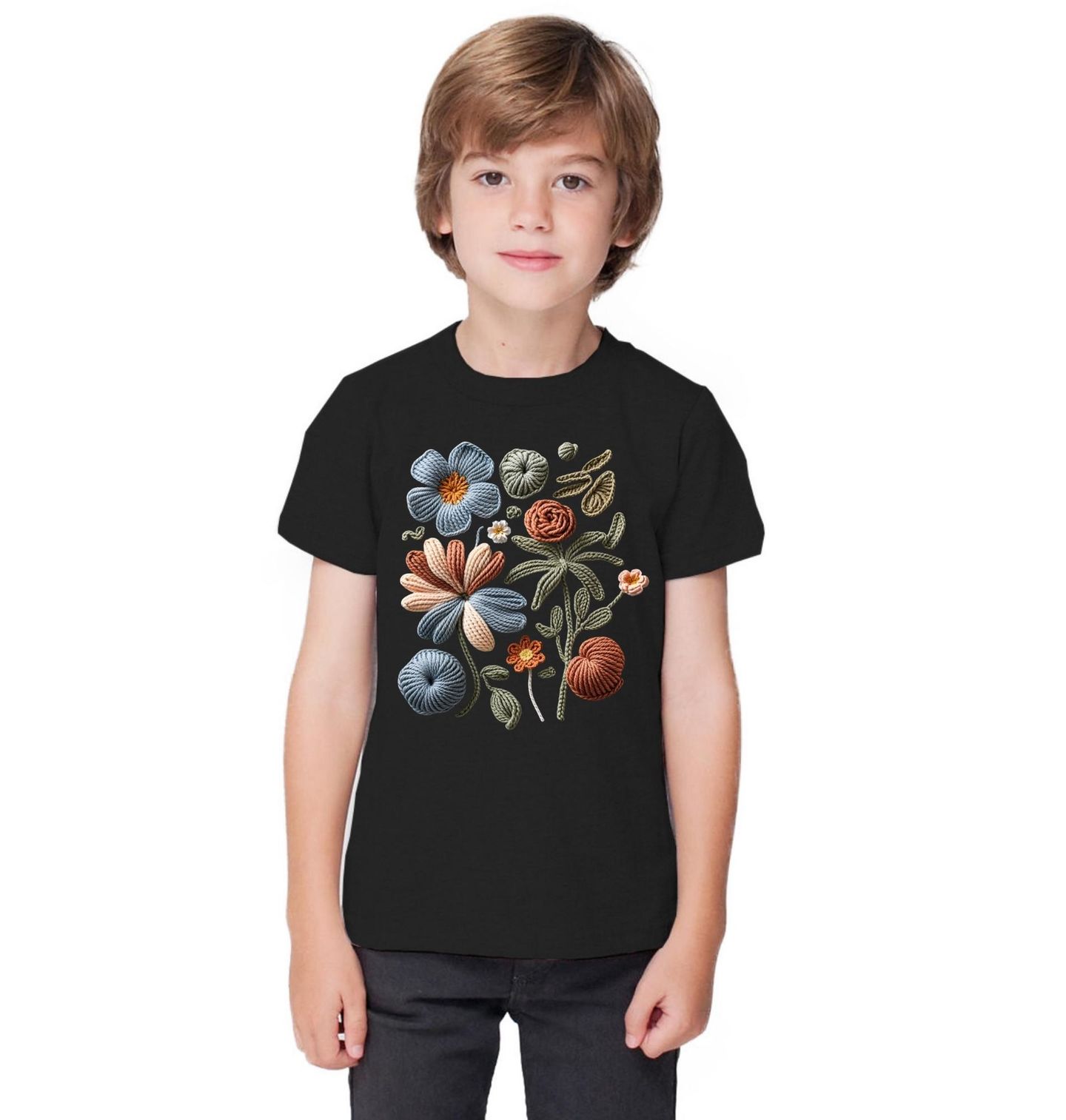 Dětské tričko Háčkované Jarní Květiny. Motiv je vytištěný potiskem – nejedná se o výšivku ani háčkovaný 3D prvek! Romantický motiv ve stylu ručních prací přináší něžné květiny vytvořené v háčkovaném vzhledu, které působí hřejivě a originálně. Detailní struktura připomíná přízi a ruční tvorbu, díky čemuž motiv vynikne na první pohled a dodá oblečení osobitý charakter.