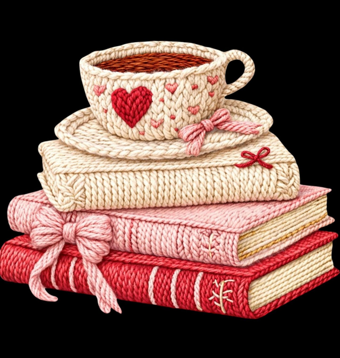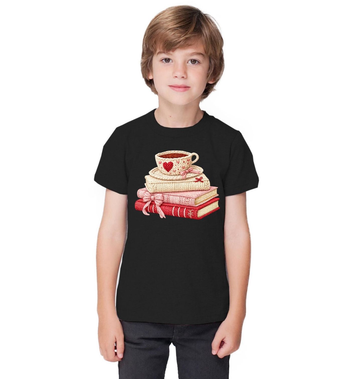 Dětské tričko Háčkované Knihy s Šálkem Kávy. Jemný a hřejivý motiv, který dokonale vystihuje atmosféru klidných večerů – hrníček plný teplého nápoje, hebce zpracované knihy a detailně laděný pletený design, který působí útulně a stylově zároveň. Tento originální motiv přináší pocit pohody, relaxace a radosti z malých okamžiků.