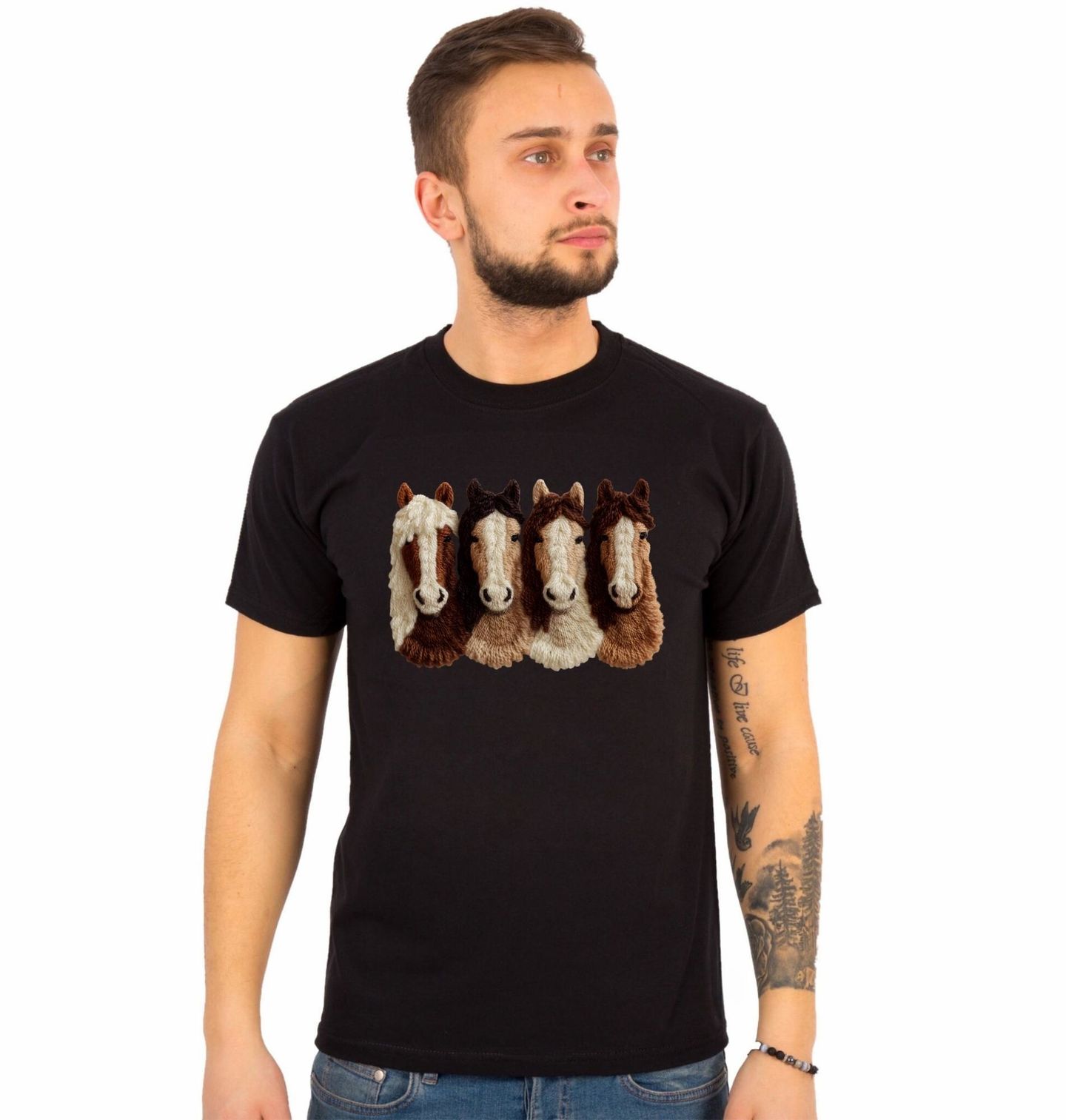 Pánské tričko Háčkované Koně. Motiv je vytištěný potiskem – nejedná se o výšivku ani háčkovaný 3D prvek! Každý kůň má odlišnou barvu i výraz, díky čemuž motiv působí živě a přátelsky. Detailní textura připomínající ruční práci dodává celému motivu jedinečný charakter a zaujme všechny milovníky koní i originálních ilustrací.