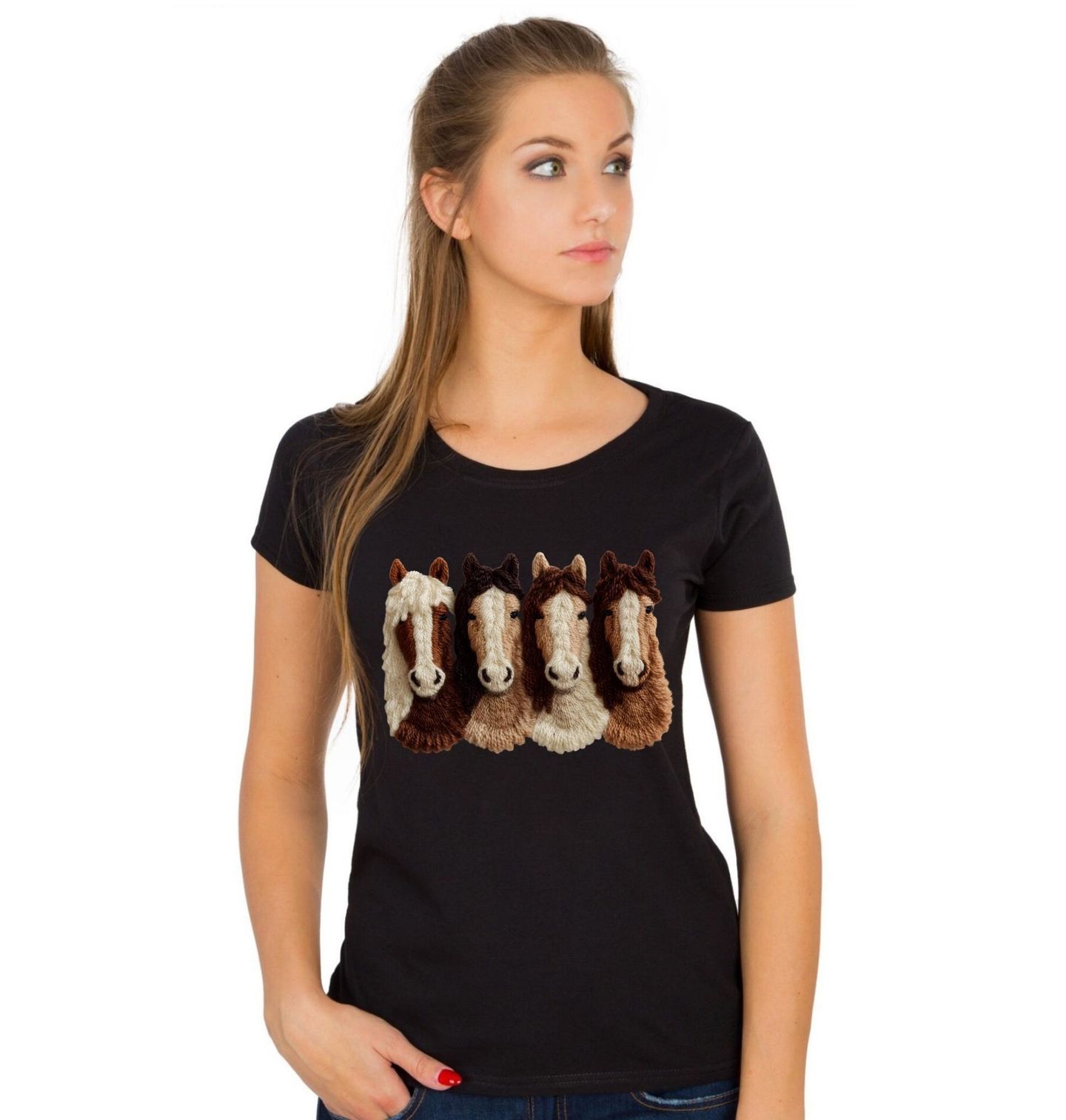 Dámské tričko Háčkované Koně. Motiv je vytištěný potiskem – nejedná se o výšivku ani háčkovaný 3D prvek! Každý kůň má odlišnou barvu i výraz, díky čemuž motiv působí živě a přátelsky. Detailní textura připomínající ruční práci dodává celému motivu jedinečný charakter a zaujme všechny milovníky koní i originálních ilustrací.
