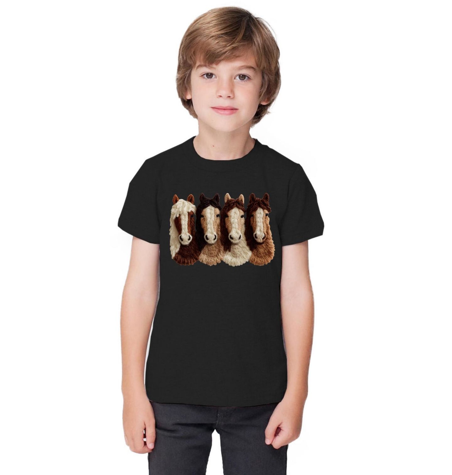 Dětské tričko Háčkované Koně. Motiv je vytištěný potiskem – nejedná se o výšivku ani háčkovaný 3D prvek! Každý kůň má odlišnou barvu i výraz, díky čemuž motiv působí živě a přátelsky. Detailní textura připomínající ruční práci dodává celému motivu jedinečný charakter a zaujme všechny milovníky koní i originálních ilustrací.