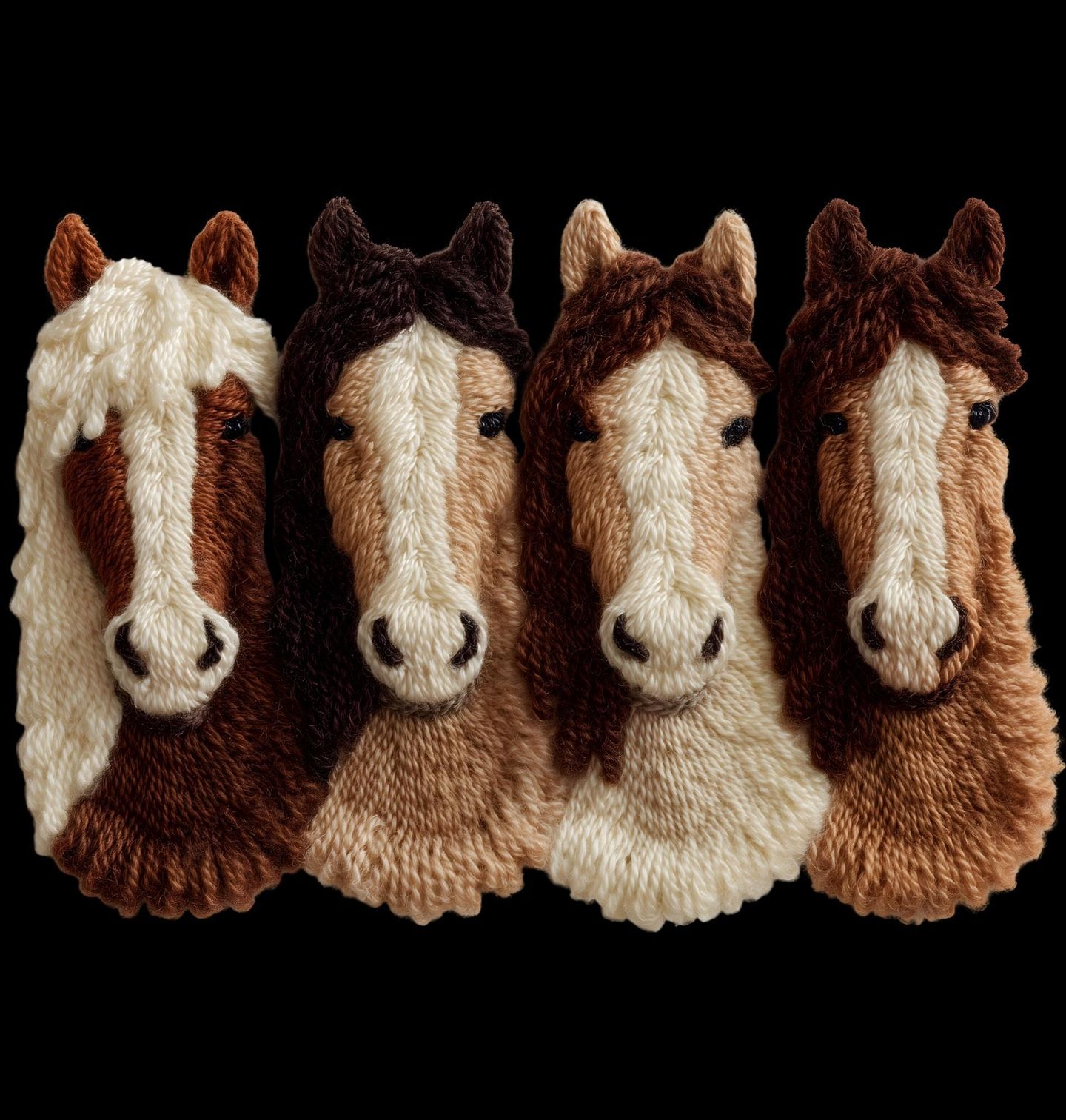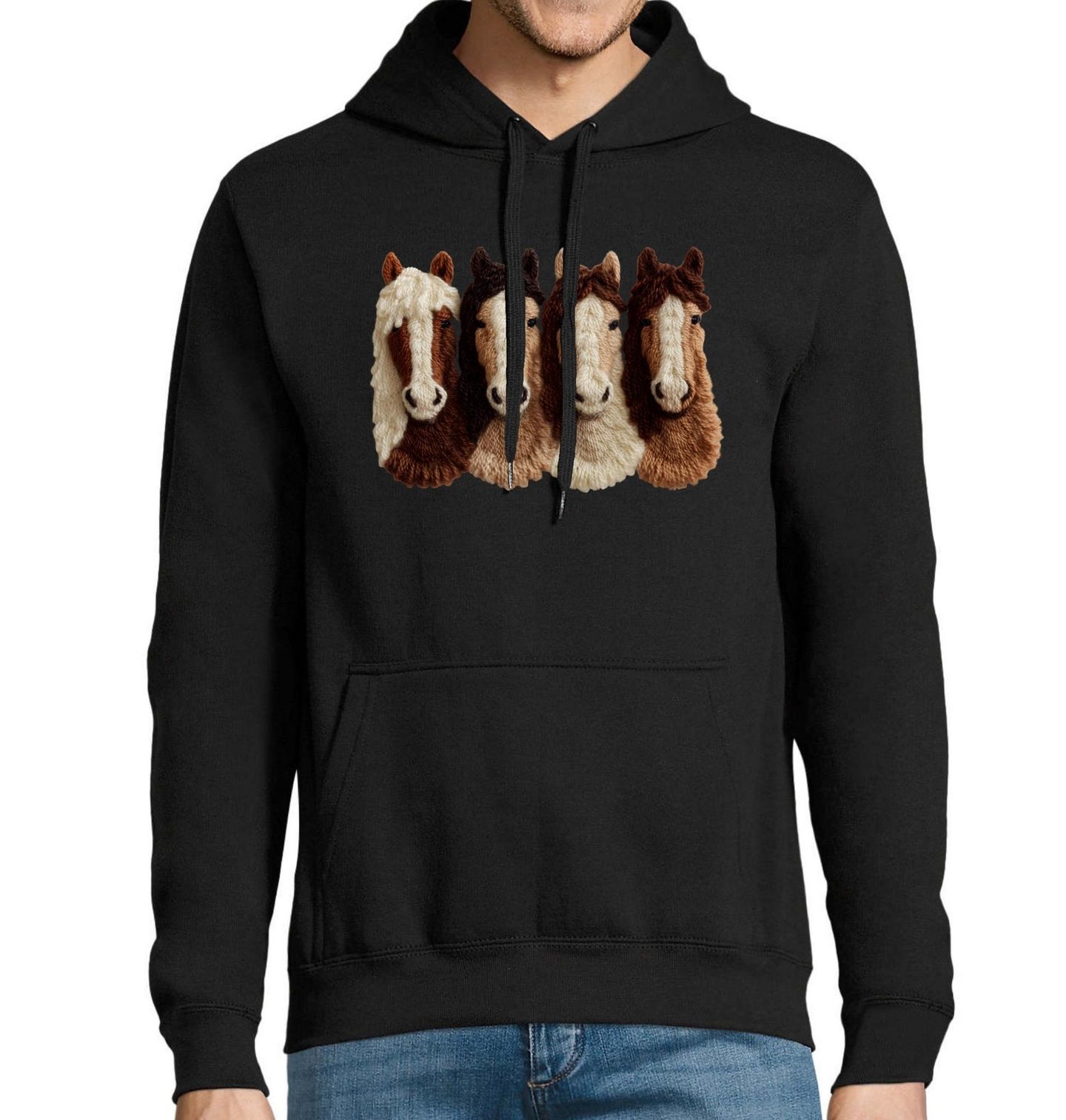 Pánská mikina Háčkované Koně. Motiv je vytištěný potiskem – nejedná se o výšivku ani háčkovaný 3D prvek! Každý kůň má odlišnou barvu i výraz, díky čemuž motiv působí živě a přátelsky. Detailní textura připomínající ruční práci dodává celému motivu jedinečný charakter a zaujme všechny milovníky koní i originálních ilustrací.