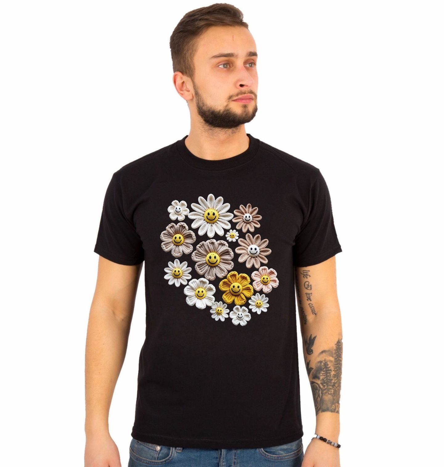 Pánské tričko Háčkované Kopretiny. Motiv je vytištěný potiskem – nejedná se o výšivku ani háčkovaný 3D prvek! Roztomilý design plný radosti, kde hlavní roli hrají stylizované květiny s usměvavými tvářemi. Motiv připomíná především kopretiny nebo sedmikrásky, ale jde o hravou ilustraci, která kombinuje fantazii a jemný handmade vzhled.