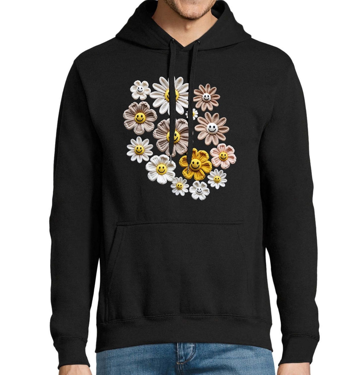 Pánská mikina Háčkované Kopretiny. Motiv je vytištěný potiskem – nejedná se o výšivku ani háčkovaný 3D prvek! Roztomilý design plný radosti, kde hlavní roli hrají stylizované květiny s usměvavými tvářemi. Motiv připomíná především kopretiny nebo sedmikrásky, ale jde o hravou ilustraci, která kombinuje fantazii a jemný handmade vzhled.