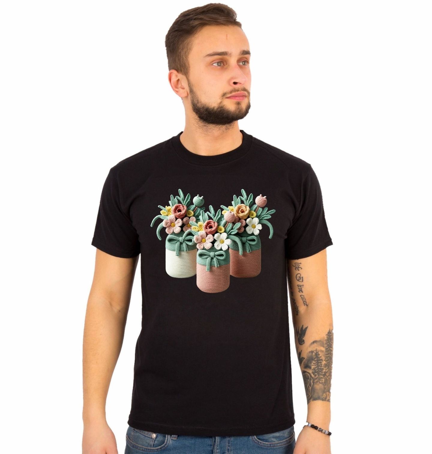 Pánské tričko Háčkované Květiny. Motiv je vytištěný potiskem – nejedná se o výšivku ani háčkovaný 3D prvek! Jemný a romantický design, kde hlavní roli hrají roztomilé háčkované květiny v pastelových nádobkách. Tento motiv působí útulně, hravě a zároveň elegantně, takže se skvěle hodí pro každého, kdo miluje přírodu, kreativitu a stylové detaily.