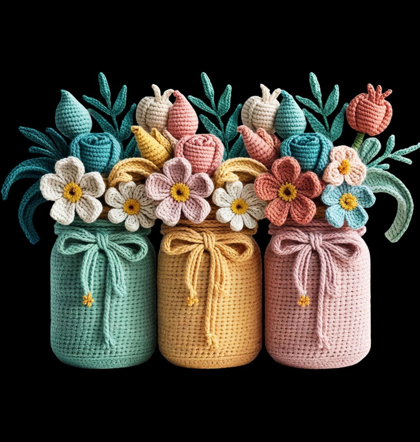 Pánské tričko Háčkované Květiny ve Váze. Motiv je vytištěný potiskem – nejedná se o výšivku ani háčkovaný 3D prvek! Jemný a originální design, kde hlavní roli hrají roztomilé háčkované květiny naaranžované v pastelových nádobách. Tento motiv spojuje něžné barvy, ručně tvořený vzhled a hravou atmosféru, díky které působí velmi útulně a stylově.