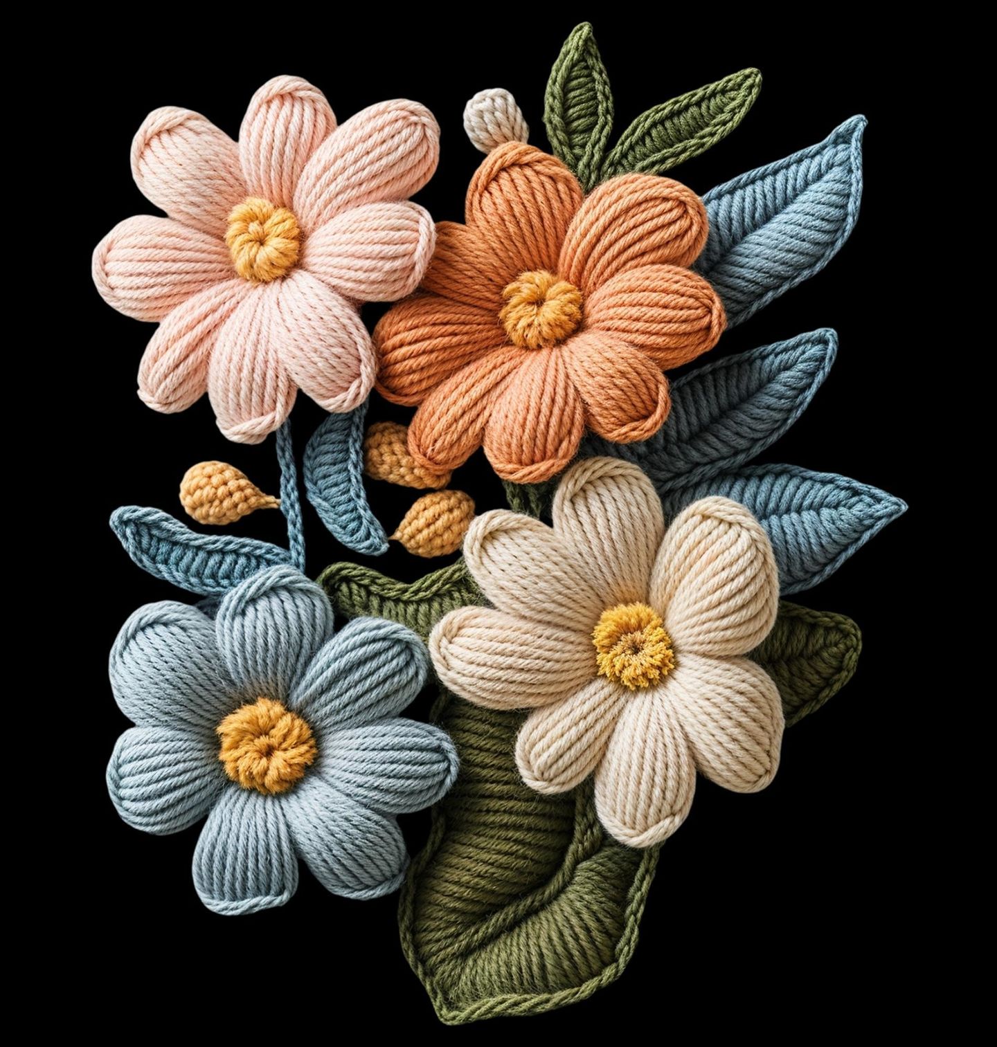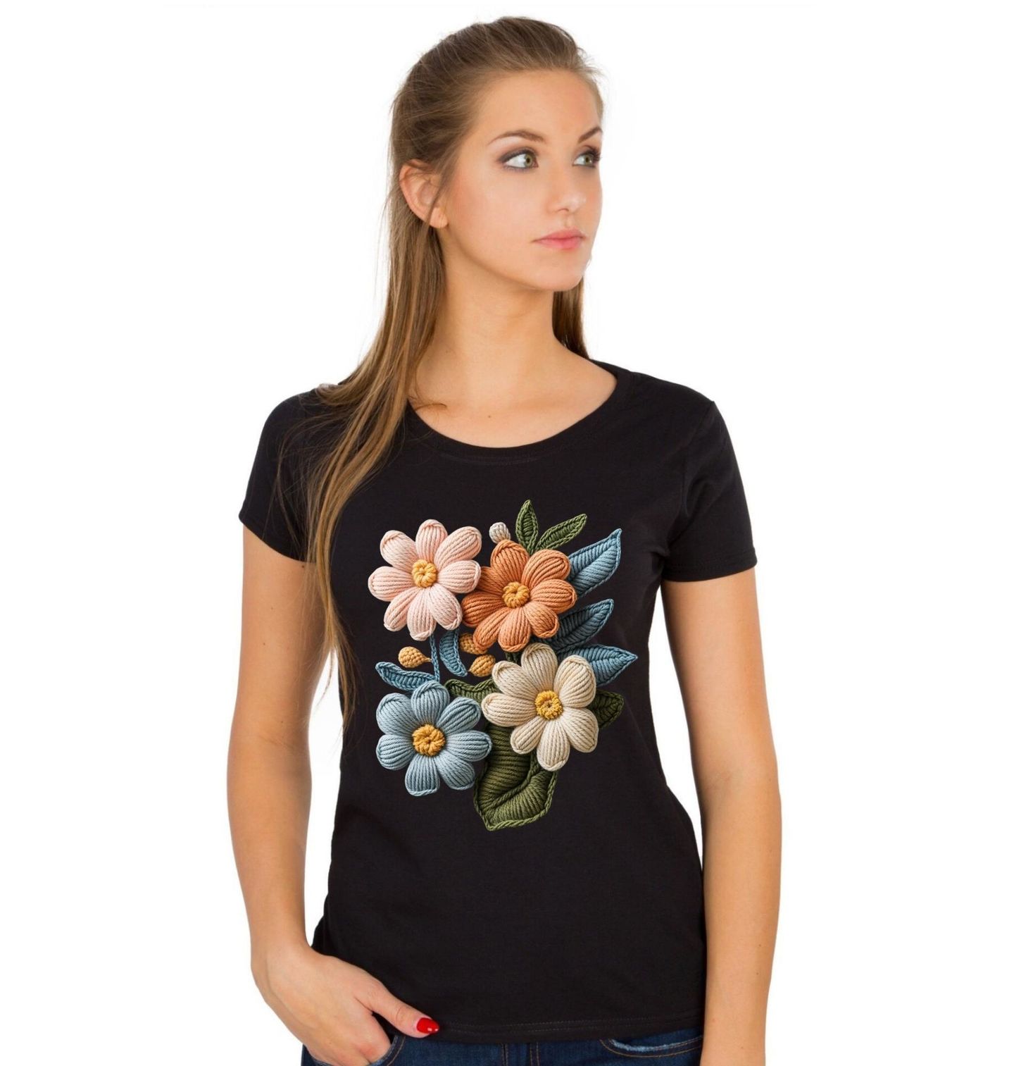 Dámské tričko Háčkované Luční Květiny. Motiv je vytištěný potiskem – nejedná se o výšivku ani háčkovaný 3D prvek! Jemný motiv, kde dominují květiny ve stylu háčkované příze, působí hřejivě, romanticky a zároveň moderně. Pokud miluješ květiny a ručně tvořený vzhled, tento motiv ti přinese pocit útulnosti a originality do každodenního outfitu.